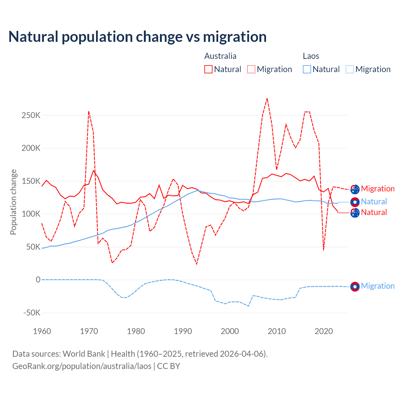 Over the last 10 years, 43.6% of the population change in Australia is from natural causes (a gain of 1,389,408 people) and 56.4% is from migration (a gain of 1,798,171 people). In Laos 90.6% is from natural causes (a gain of 1,183,013 people) and 9.41% is from migration (a loss of 122,899 people).