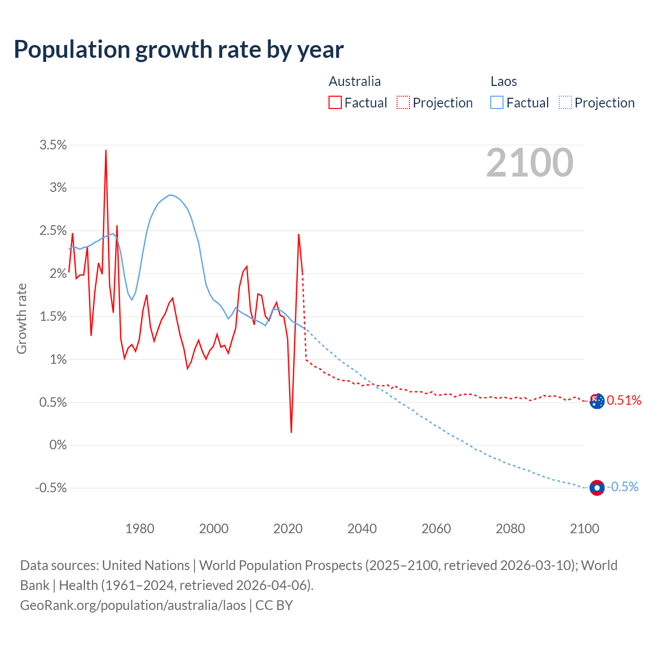 - For the last 10 years, Australia has had an average growth rate of +1.49% per year vs +1.48% in Laos.