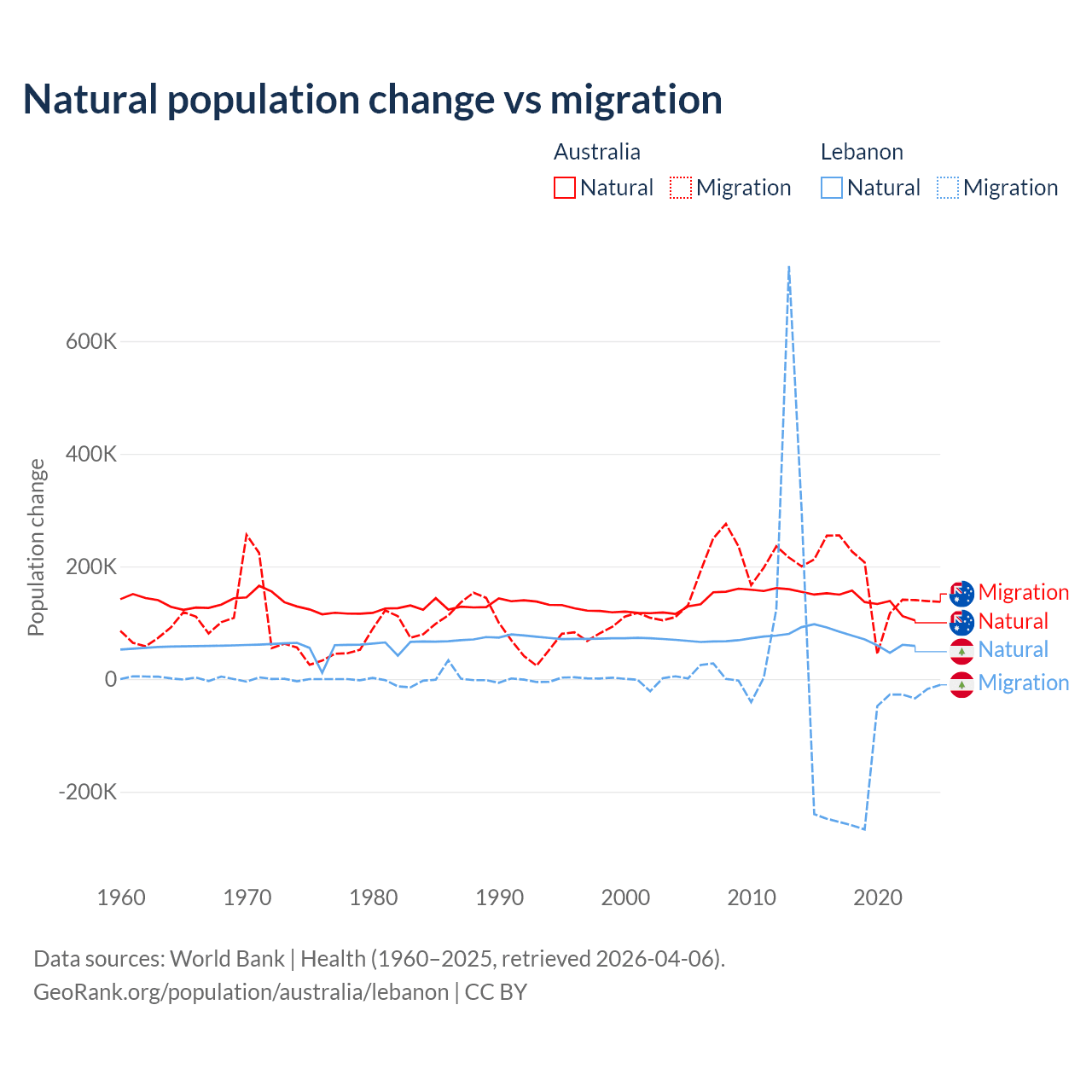 Over the last 10 years, 43.6% of the population change in Australia is from natural causes (a gain of 1,389,408 people) and 56.4% is from migration (a gain of 1,798,171 people). In Lebanon 40.1% is from natural causes (a gain of 739,256 people) and 59.9% is from migration (a loss of 1,103,772 people).