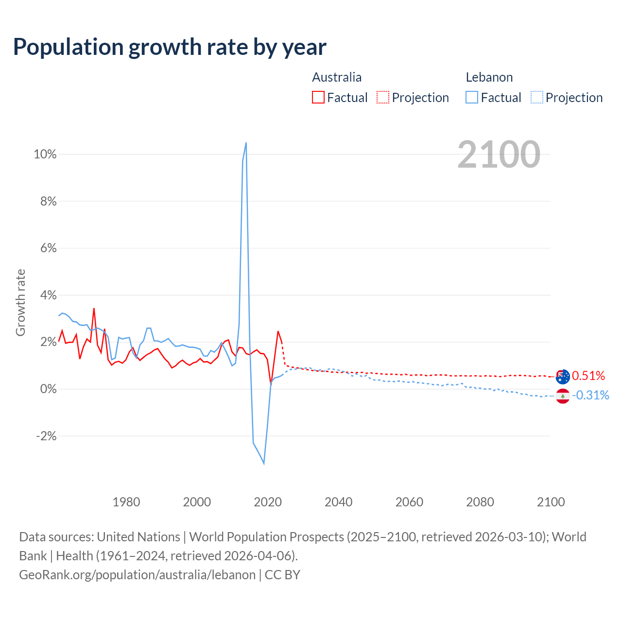 - For the last 10 years, Australia has had an average growth rate of +1.49% per year vs +0.16% in Lebanon.