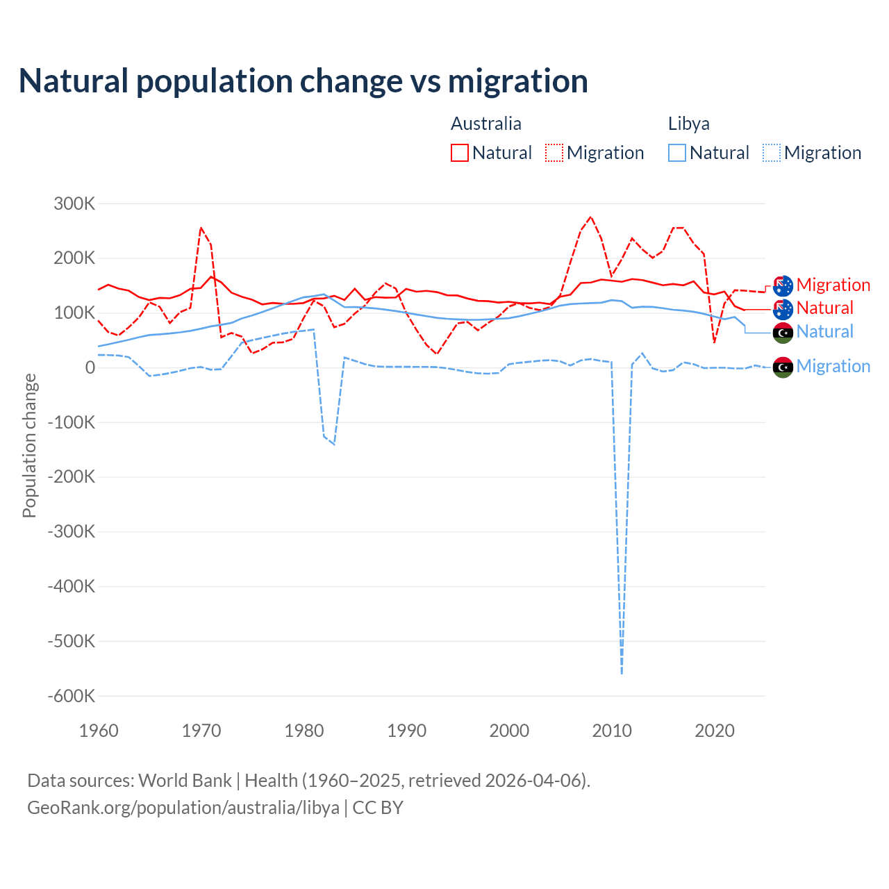 Over the last 10 years, 43.6% of the population change in Australia is from natural causes (a gain of 1,389,408 people) and 56.4% is from migration (a gain of 1,798,171 people). In Libya 99.4% is from natural causes (a gain of 975,799 people) and 0.63% is from migration (a loss of 6,150 people).