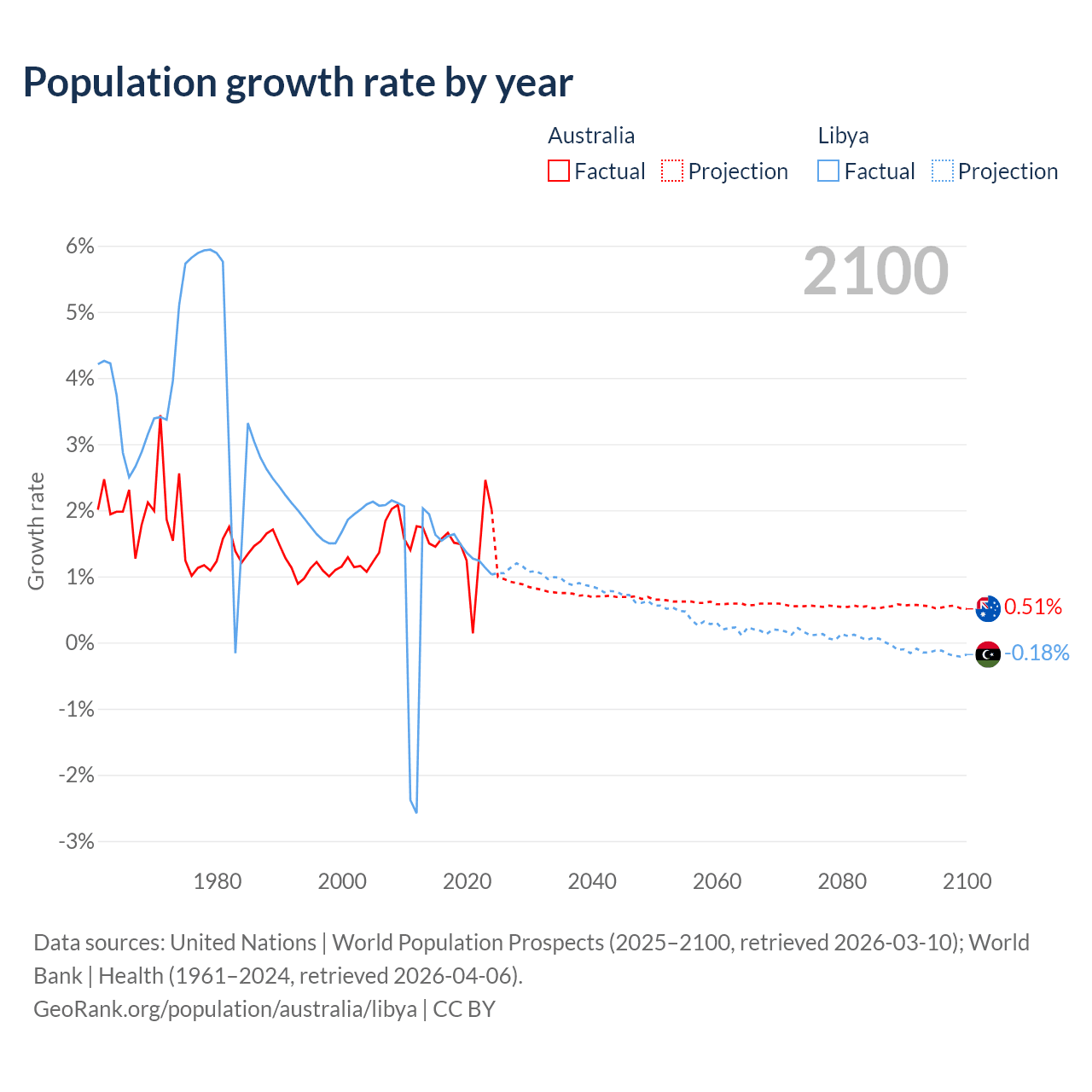 - For the last 10 years, Australia has had an average growth rate of +1.49% per year vs +1.44% in Libya.
