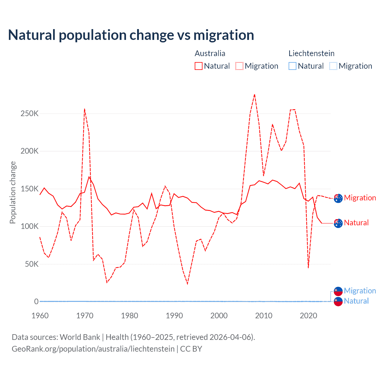 Over the last 10 years, 43.6% of the population change in Australia is from natural causes (a gain of 1,389,408 people) and 56.4% is from migration (a gain of 1,798,171 people). In Liechtenstein 32.4% is from natural causes (a gain of 883 people) and 67.6% is from migration (a gain of 1,843 people).