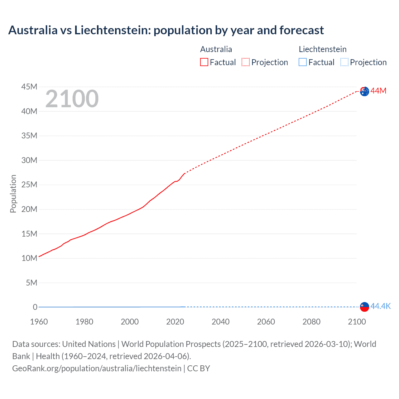 The latest officially reported population of Australia was 27,196,812 in 2024 vs 40,450 people in Liechtenstein in 2024. In 2026, based on the adjusted UN estimation, the current Australia's population is 27,799,169 people compared to 41,038 in Liechtenstein.