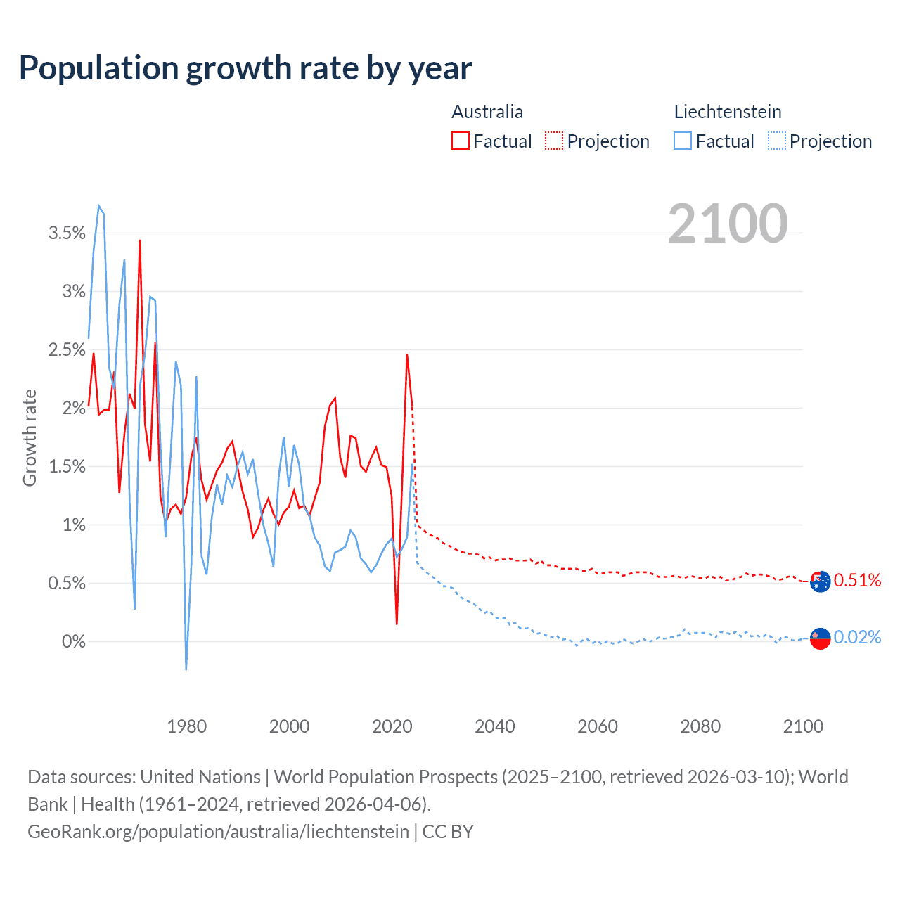 - For the last 10 years, Australia has had an average growth rate of +1.49% per year vs +0.82% in Liechtenstein.