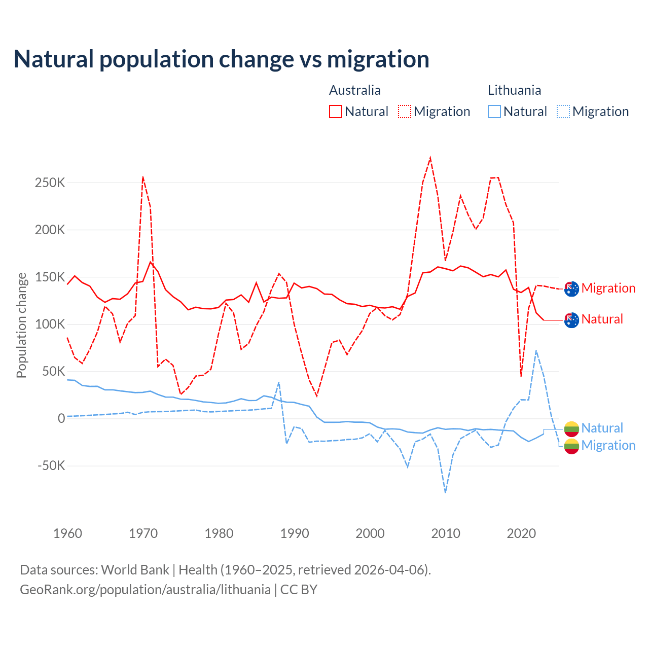 Over the last 10 years, 43.6% of the population change in Australia is from natural causes (a gain of 1,389,408 people) and 56.4% is from migration (a gain of 1,798,171 people). In Lithuania 68.7% is from natural causes (a loss of 153,859 people) and 31.3% is from migration (a gain of 70,196 people).
