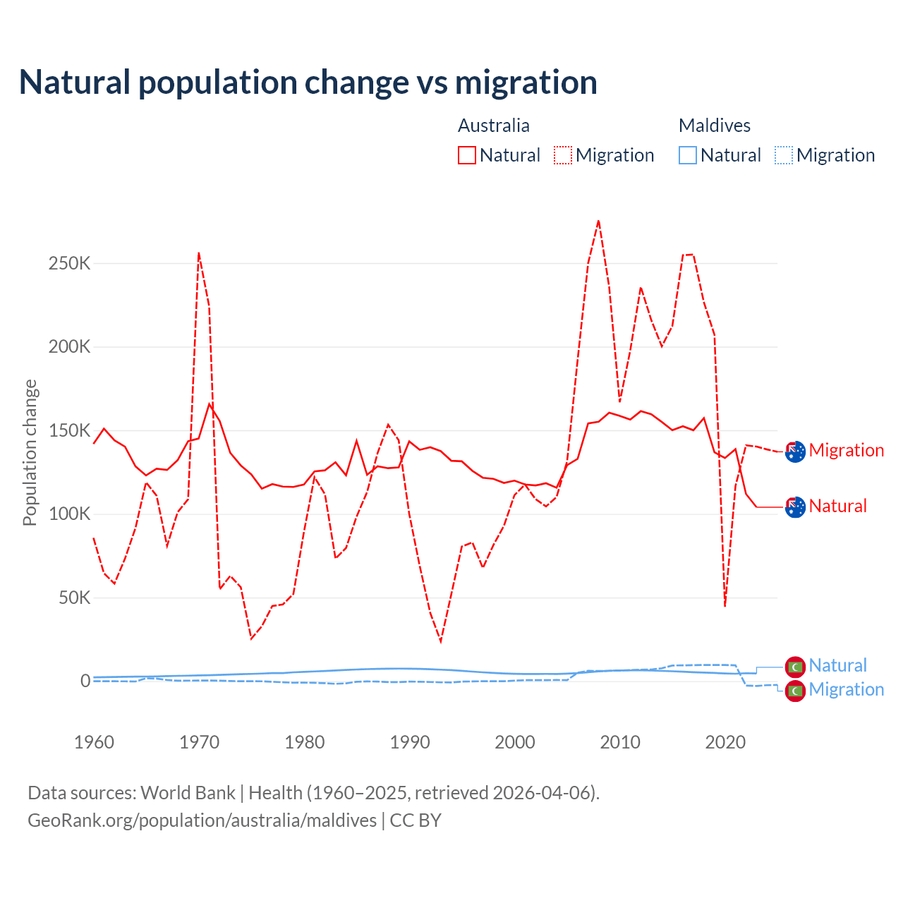 Over the last 10 years, 43.6% of the population change in Australia is from natural causes (a gain of 1,389,408 people) and 56.4% is from migration (a gain of 1,798,171 people). In Maldives 42.7% is from natural causes (a gain of 51,342 people) and 57.3% is from migration (a gain of 68,788 people).