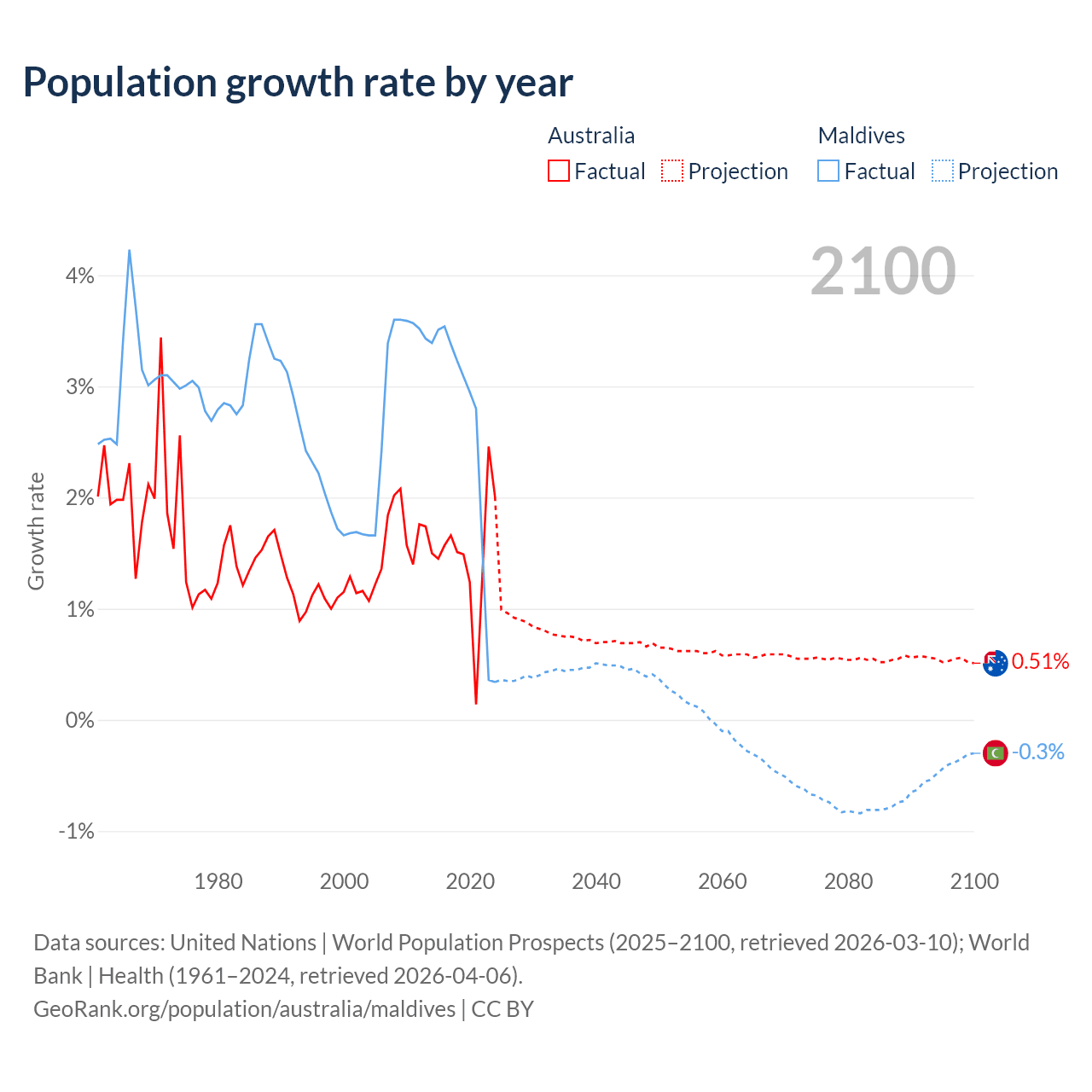 Data sources: World Bank | Health (1960–2024, retrieved 2026-04-06); United Nations | World Population Prospects (1960–2026, retrieved 2026-03-10); U.S. Census Bureau (1960–2025, retrieved 2026-02-08); Central Intelligence Agency (CIA) (2000–2019, retrieved 2026-02-20).
