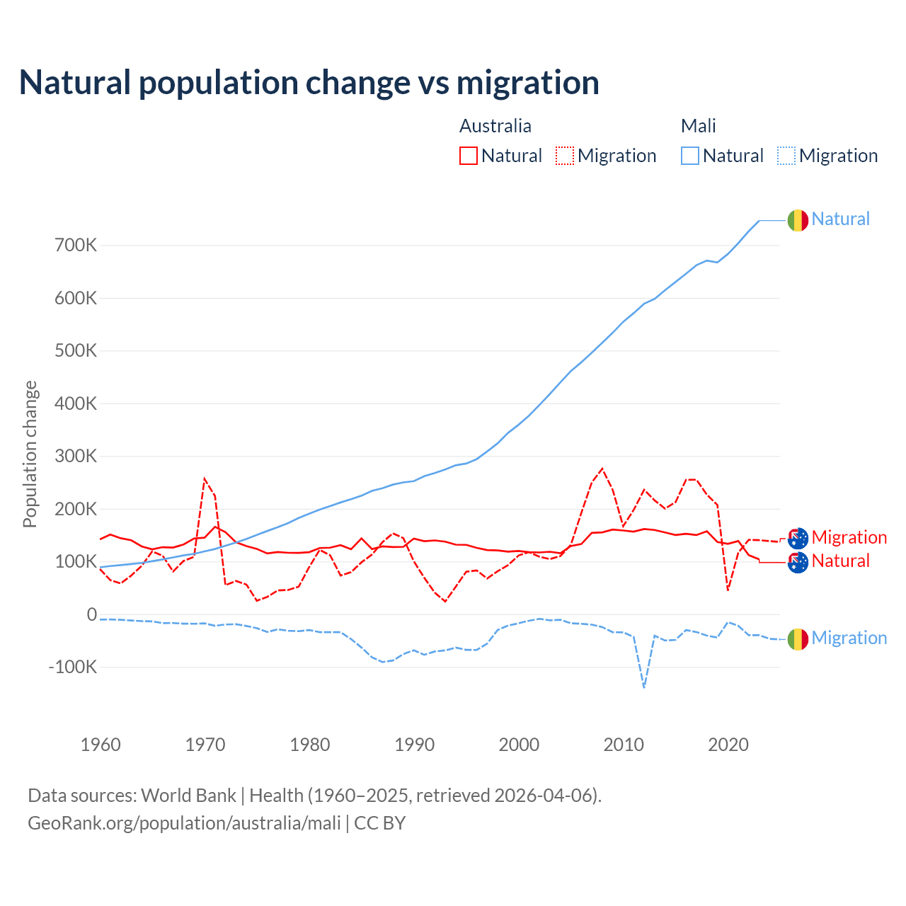 Over the last 10 years, 43.6% of the population change in Australia is from natural causes (a gain of 1,389,408 people) and 56.4% is from migration (a gain of 1,798,171 people). In Mali 94.9% is from natural causes (a gain of 6,749,473 people) and 5.13% is from migration (a loss of 365,292 people).