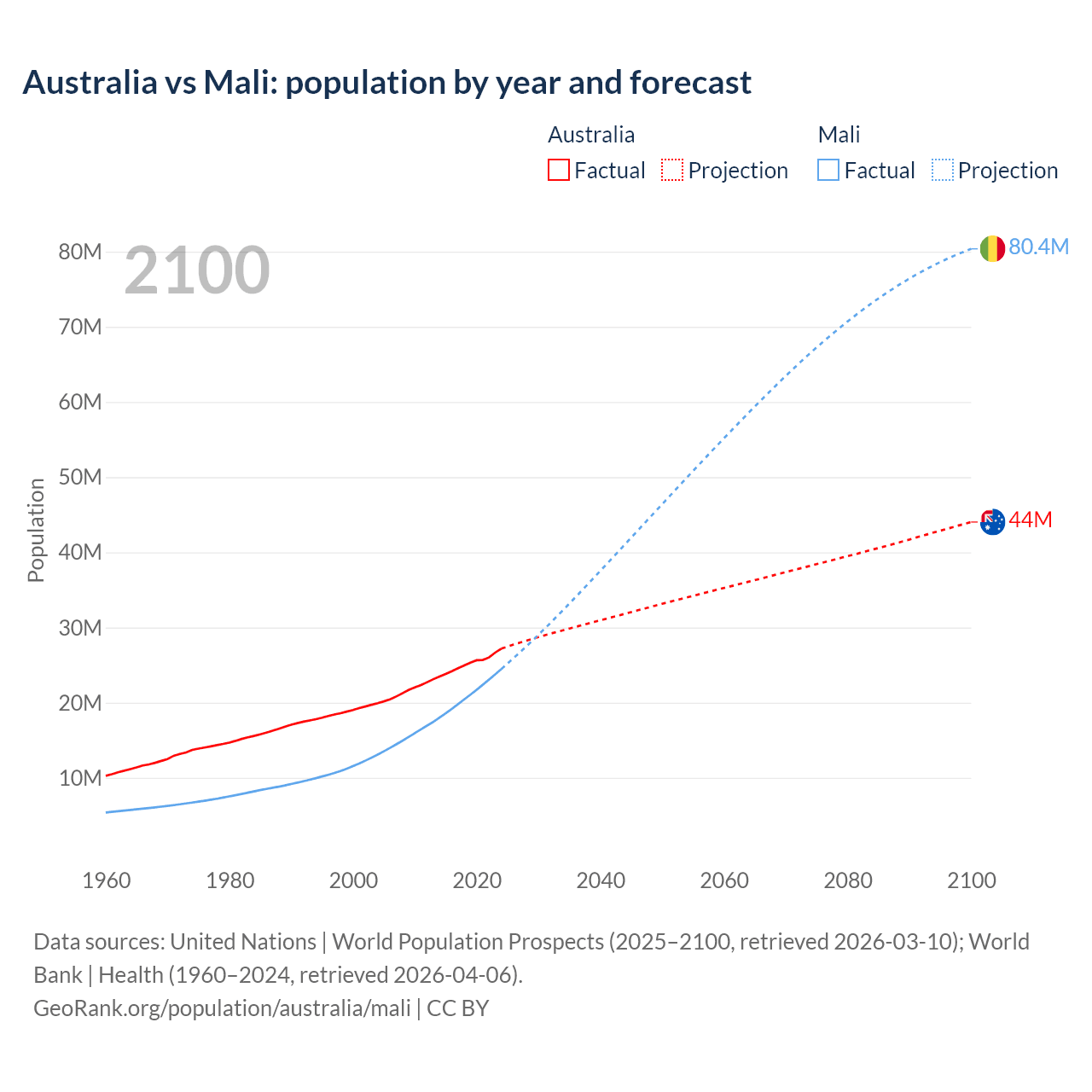 Australia vs Mali: population by year and forecast