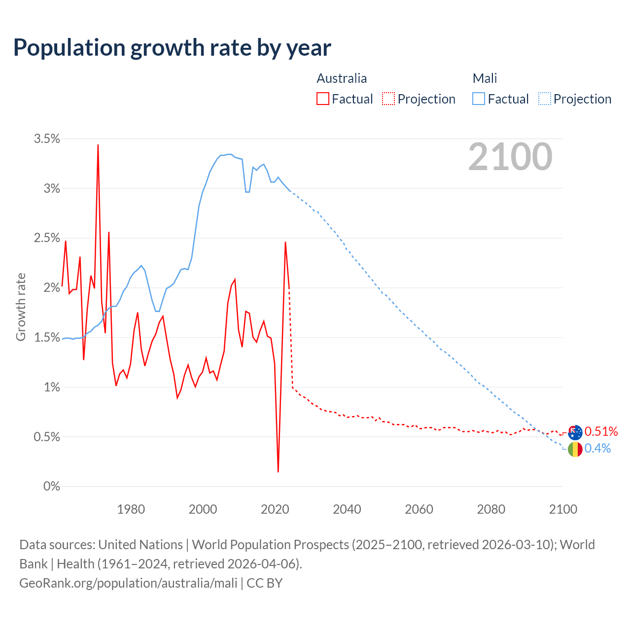 - For the last 10 years, Australia has had an average growth rate of +1.49% per year vs +3.12% in Mali.