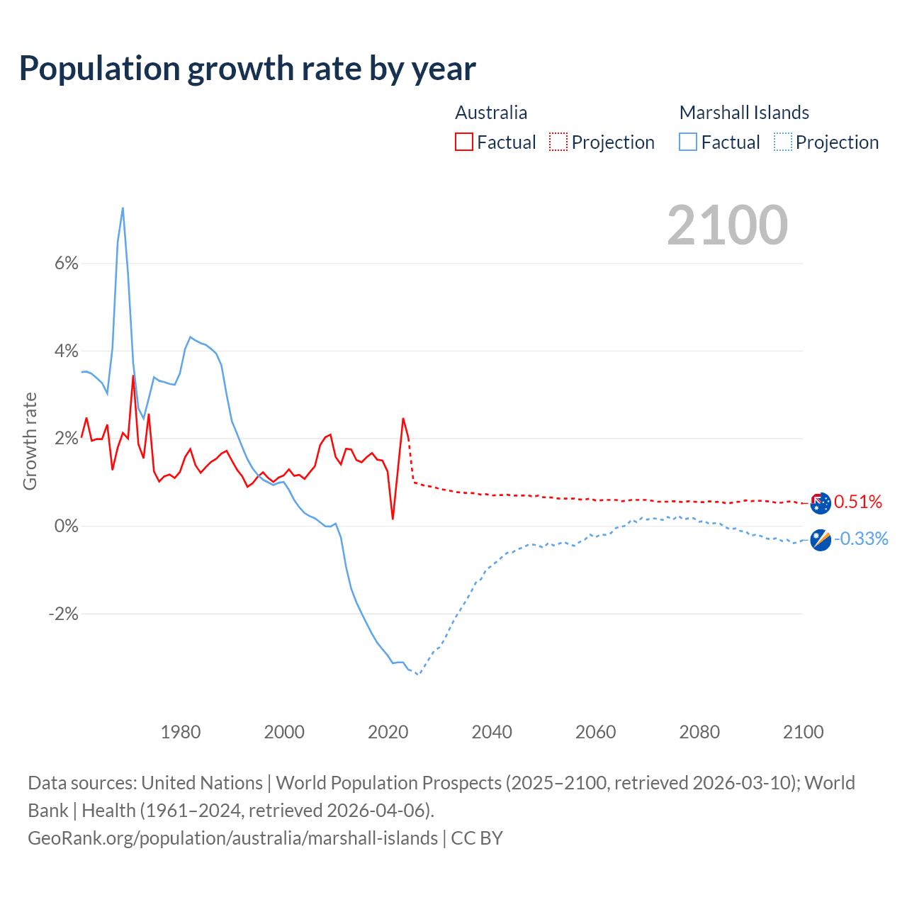 - For the last 10 years, Australia has had an average growth rate of +1.49% per year vs -2.69% in the Marshall Islands.