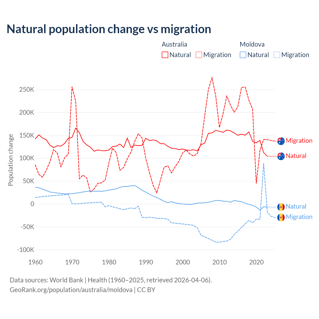 Over the last 10 years, 43.6% of the population change in Australia is from natural causes (a gain of 1,389,408 people) and 56.4% is from migration (a gain of 1,798,171 people). In Moldova 6.04% is from natural causes (a loss of 19,001 people) and 94% is from migration (a loss of 295,631 people).
