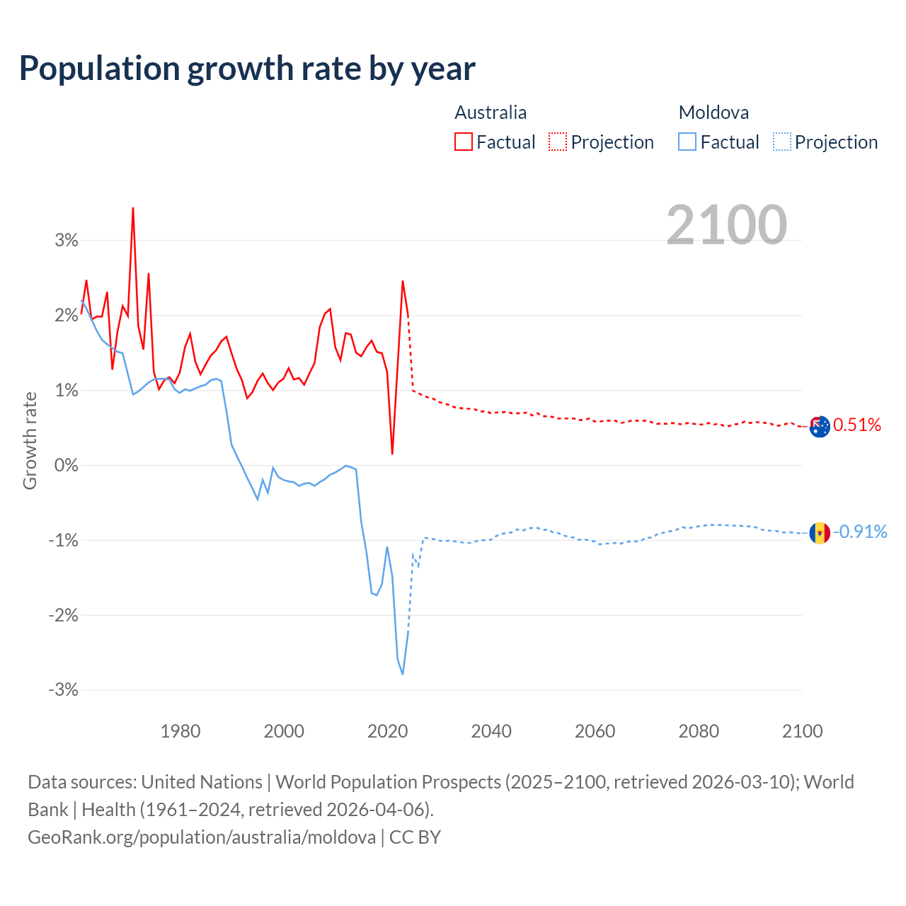 - For the last 10 years, Australia has had an average growth rate of +1.49% per year vs -1.57% in Moldova.