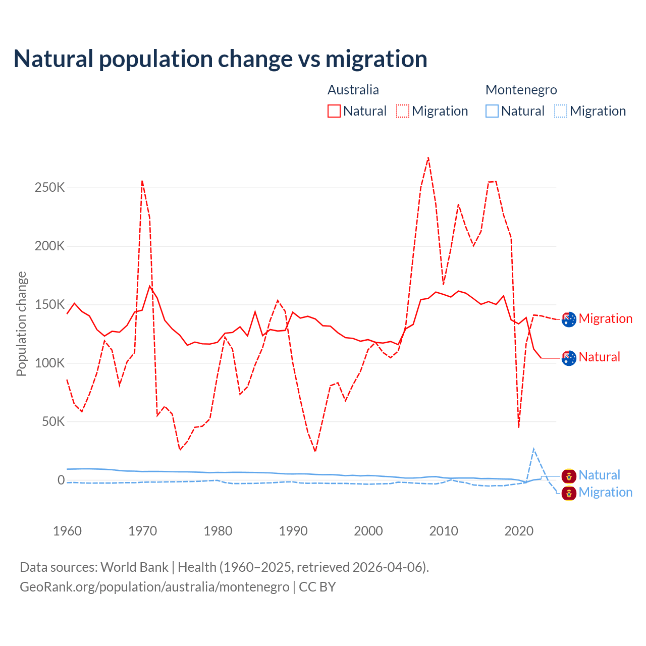 Over the last 10 years, 43.6% of the population change in Australia is from natural causes (a gain of 1,389,408 people) and 56.4% is from migration (a gain of 1,798,171 people). In Montenegro 52.4% is from natural causes (a gain of 4,501 people) and 47.6% is from migration (a gain of 4,095 people).