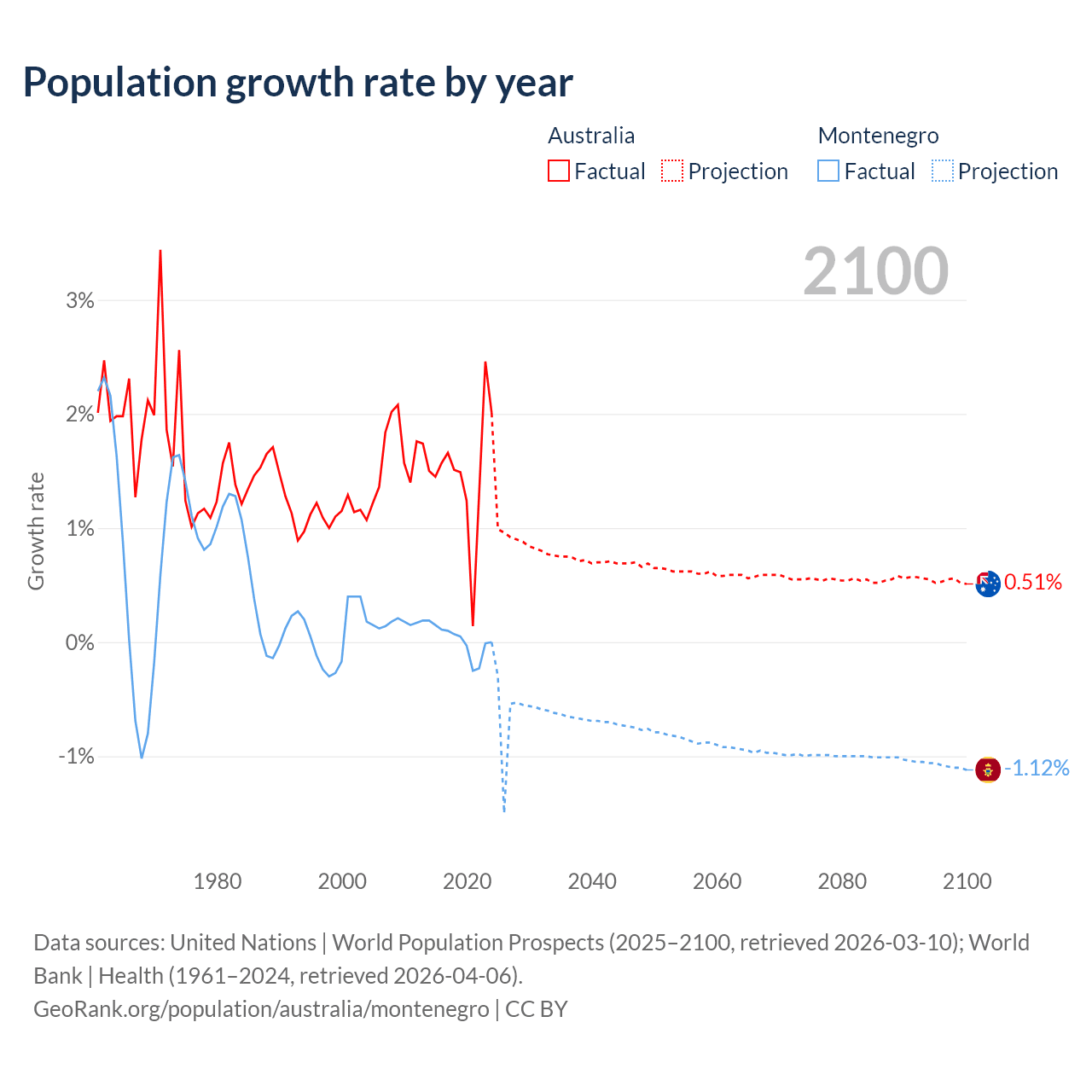 - For the last 10 years, Australia has had an average growth rate of +1.49% per year vs +0.01% in Montenegro.