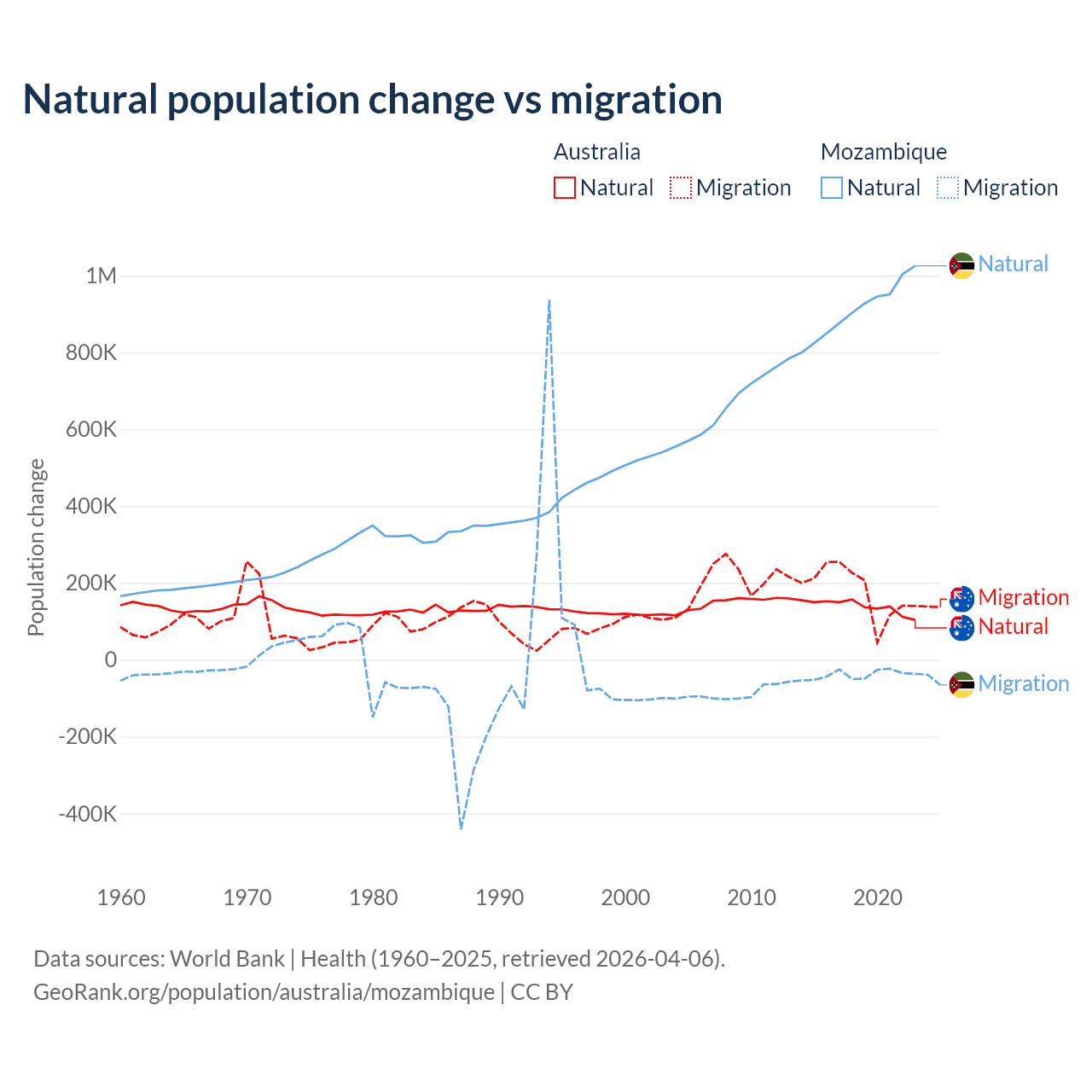 Over the last 10 years, 43.6% of the population change in Australia is from natural causes (a gain of 1,389,408 people) and 56.4% is from migration (a gain of 1,798,171 people). In Mozambique 95.9% is from natural causes (a gain of 9,108,203 people) and 4.15% is from migration (a loss of 393,923 people).