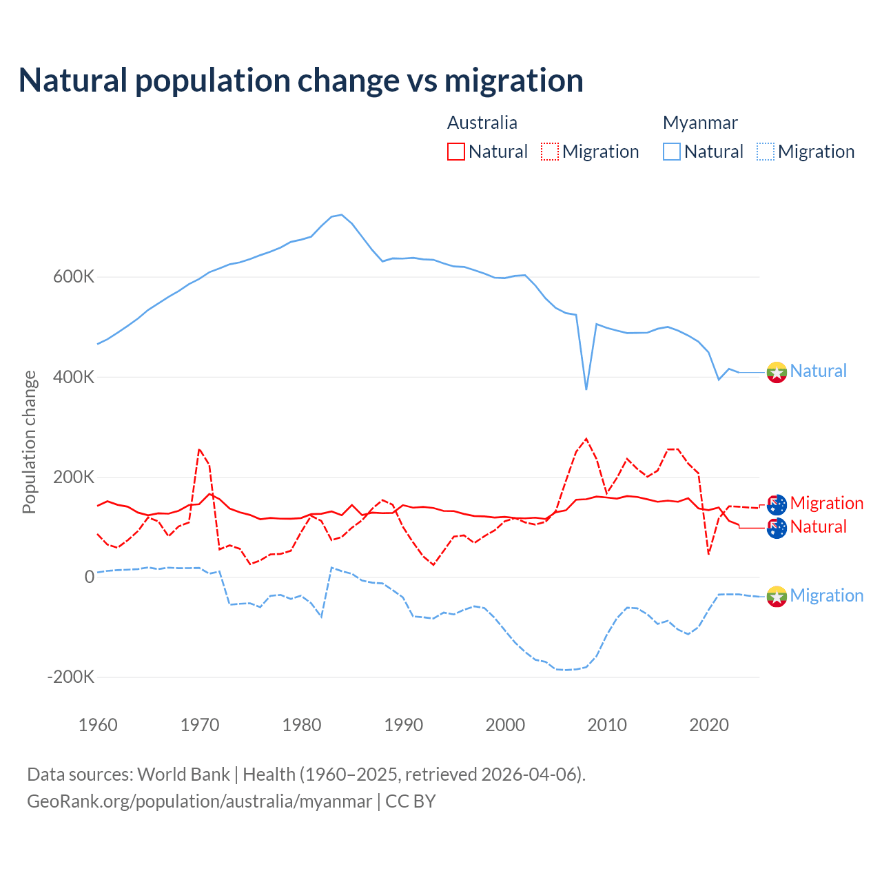 Over the last 10 years, 43.6% of the population change in Australia is from natural causes (a gain of 1,389,408 people) and 56.4% is from migration (a gain of 1,798,171 people). In Myanmar 86% is from natural causes (a gain of 4,594,615 people) and 14% is from migration (a loss of 749,272 people).