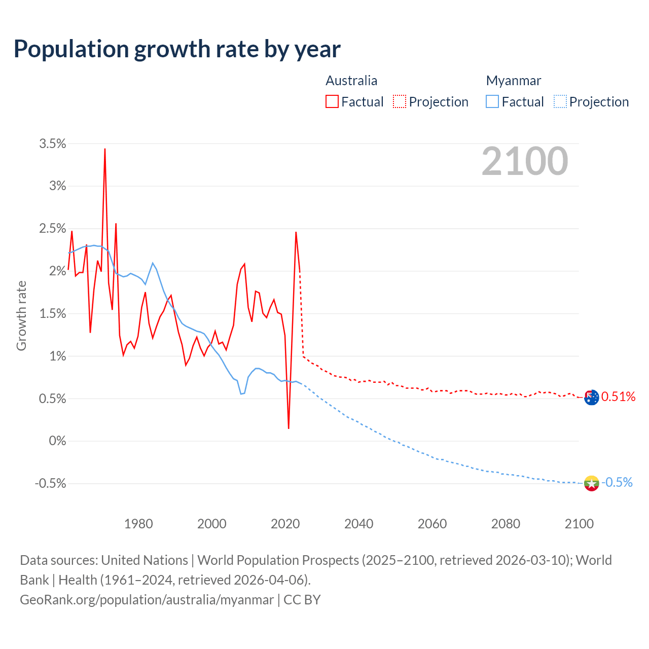 - For the last 10 years, Australia has had an average growth rate of +1.49% per year vs +0.74% in Myanmar.