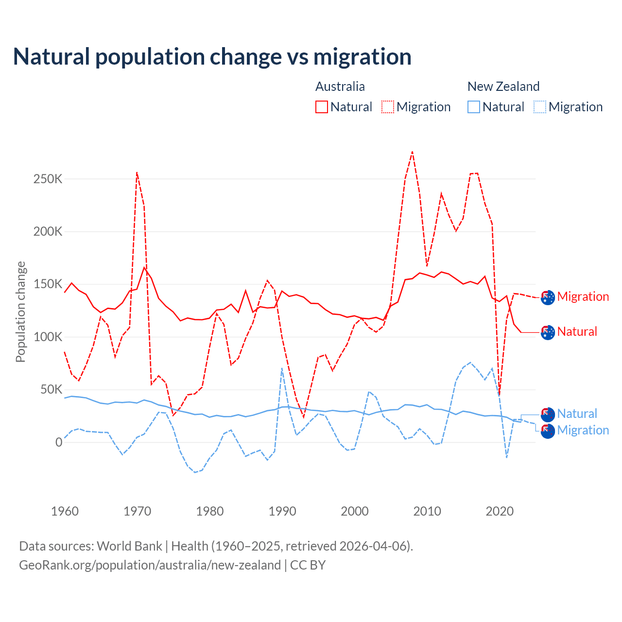 Over the last 10 years, 43.6% of the population change in Australia is from natural causes (a gain of 1,389,408 people) and 56.4% is from migration (a gain of 1,798,171 people). In New Zealand 34.4% is from natural causes (a gain of 247,767 people) and 65.6% is from migration (a gain of 471,602 people).