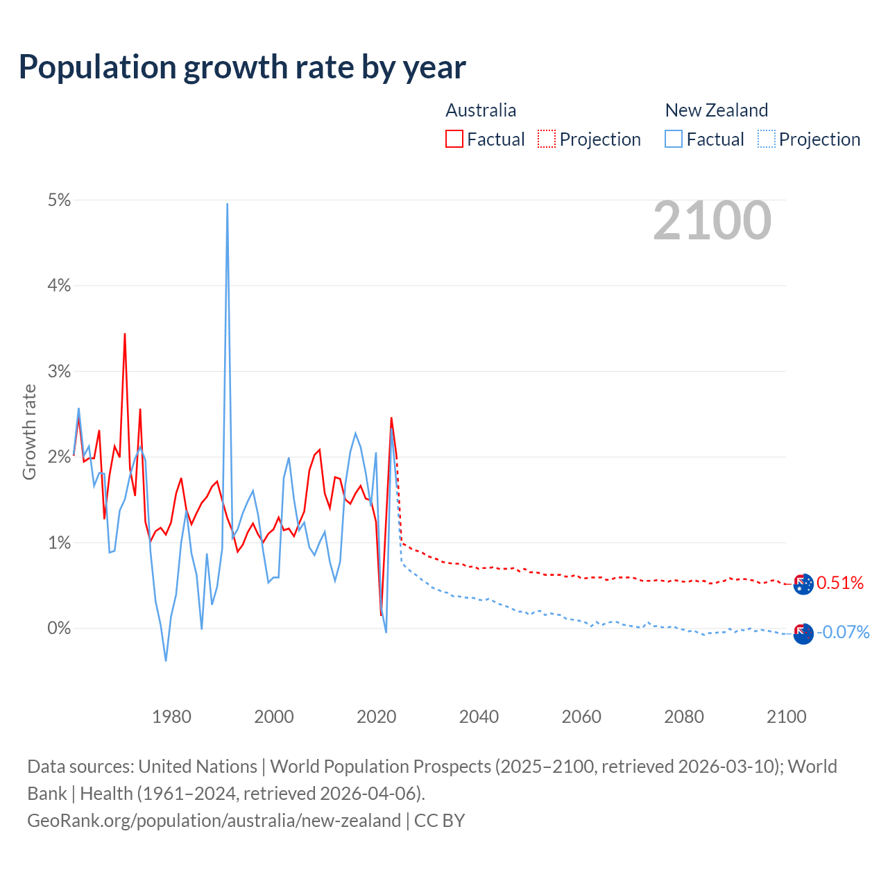 Australia vs New Zealand: population by year and forecast