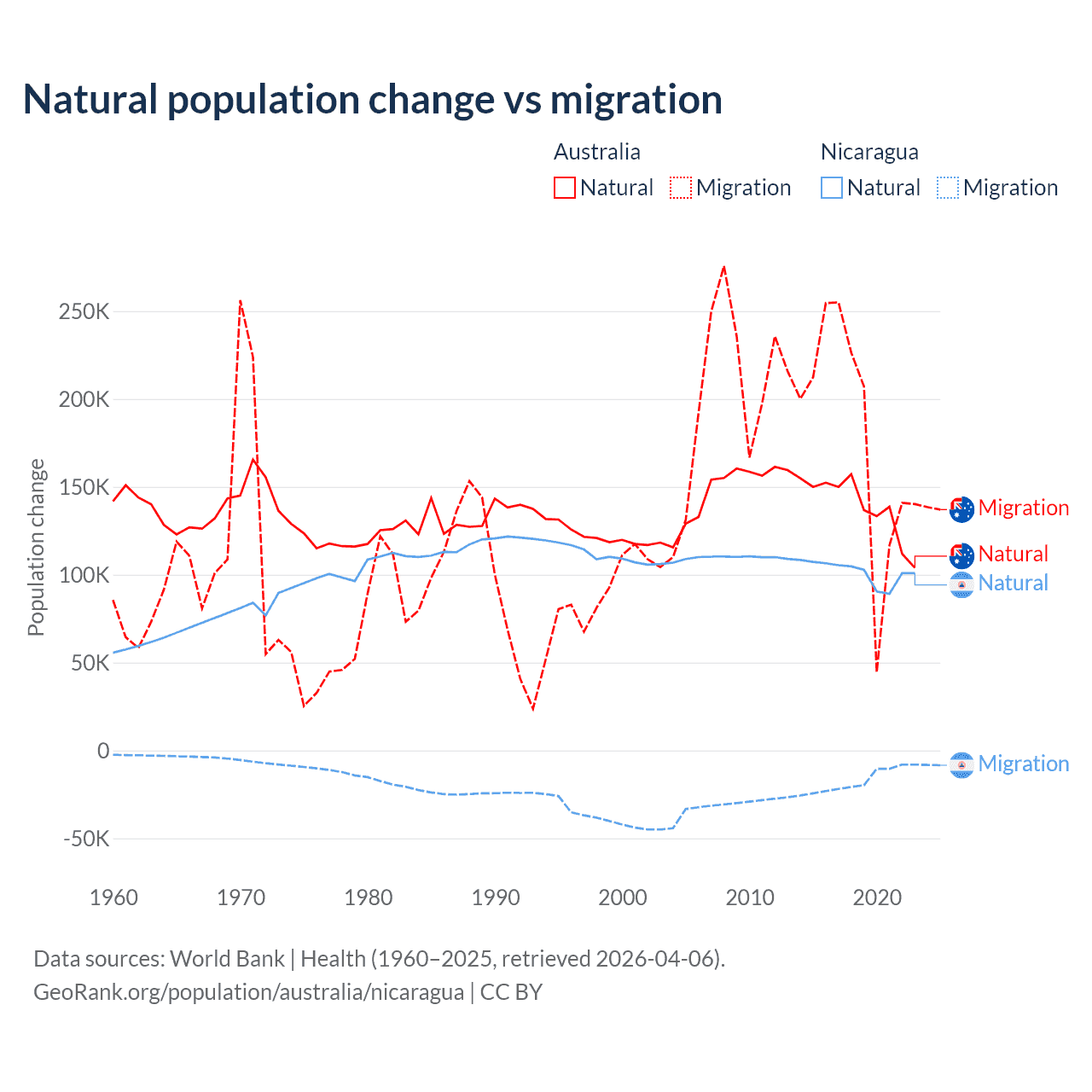 Over the last 10 years, 43.6% of the population change in Australia is from natural causes (a gain of 1,389,408 people) and 56.4% is from migration (a gain of 1,798,171 people). In Nicaragua 85.5% is from natural causes (a gain of 1,017,084 people) and 14.5% is from migration (a loss of 172,078 people).
