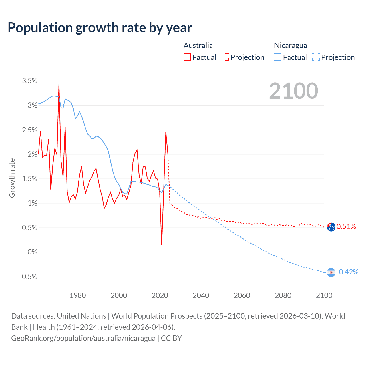 - For the last 10 years, Australia has had an average growth rate of +1.49% per year vs +1.33% in Nicaragua.