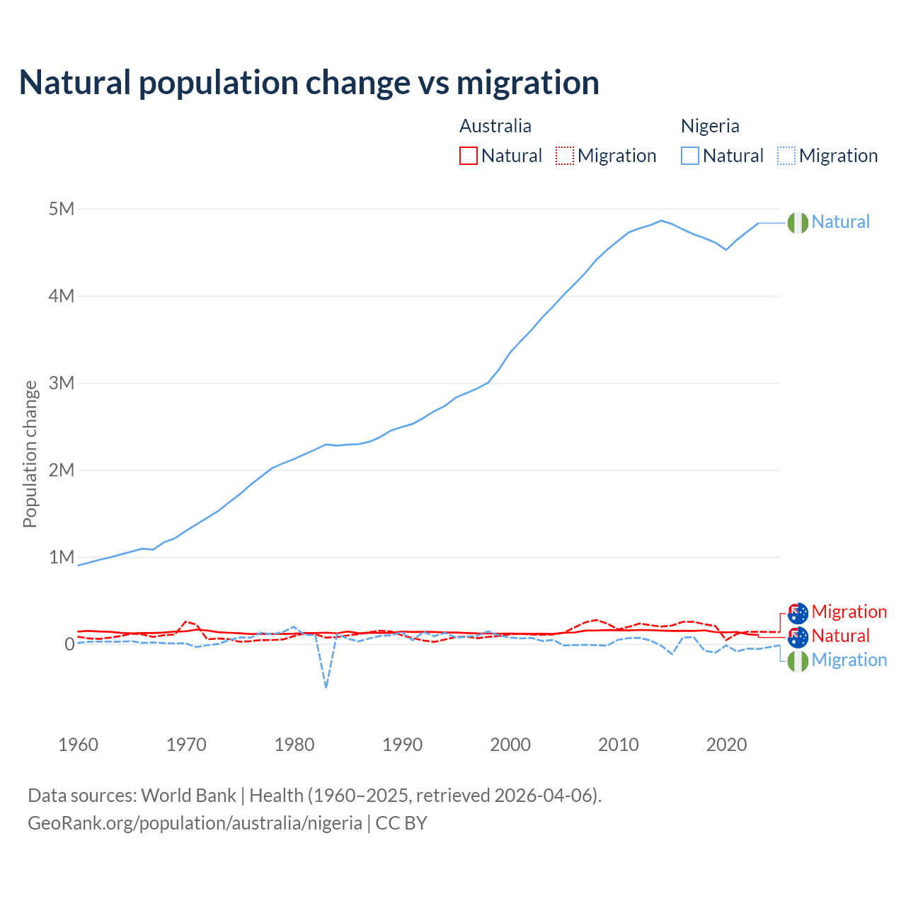 Over the last 10 years, 43.6% of the population change in Australia is from natural causes (a gain of 1,389,408 people) and 56.4% is from migration (a gain of 1,798,171 people). In Nigeria 99.2% is from natural causes (a gain of 47,163,517 people) and 0.77% is from migration (a loss of 368,103 people).