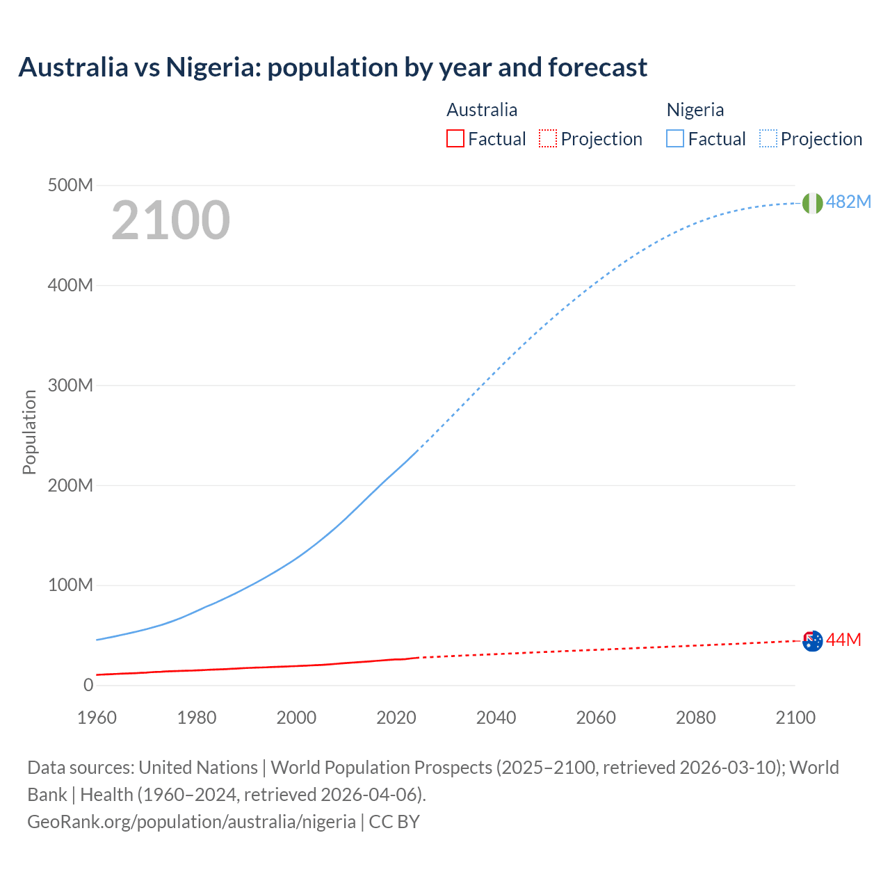 The latest officially reported population of Australia was 27,196,812 in 2024 vs 232,679,478 people in Nigeria in 2024. In 2026, based on the adjusted UN estimation, the current Australia's population is 27,799,169 people compared to 243,824,469 in Nigeria.