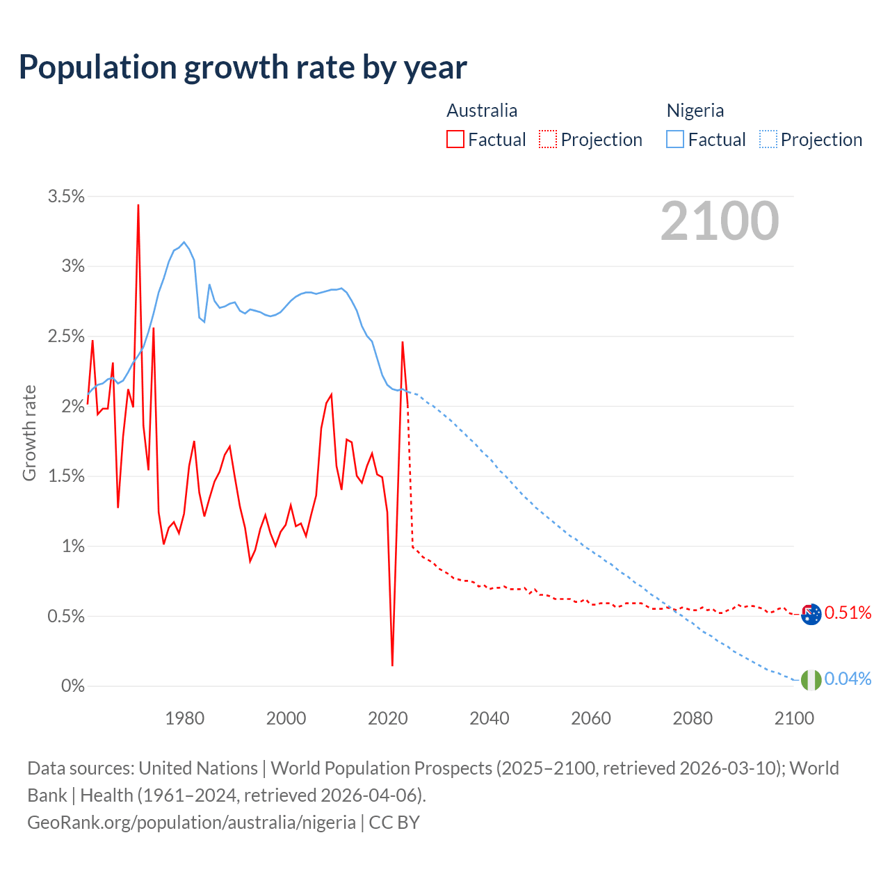 - For the last 10 years, Australia has had an average growth rate of +1.49% per year vs +2.31% in Nigeria.