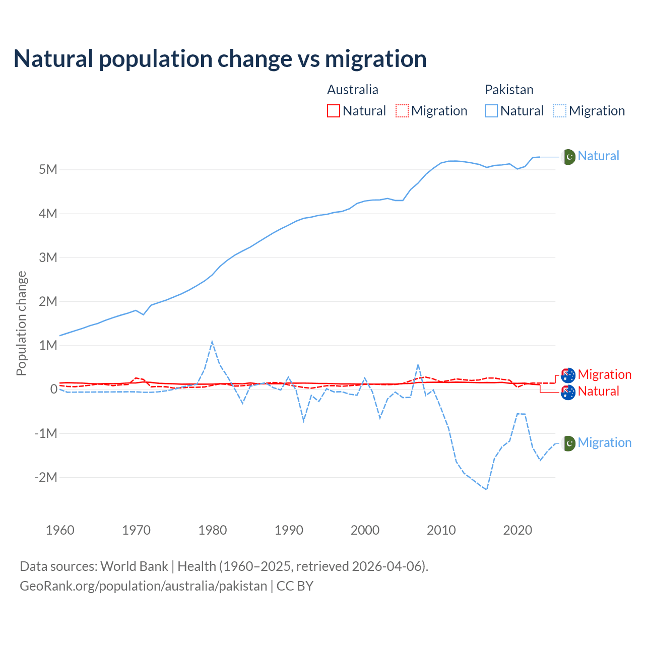 Over the last 10 years, 43.6% of the population change in Australia is from natural causes (a gain of 1,389,408 people) and 56.4% is from migration (a gain of 1,798,171 people). In Pakistan 77.8% is from natural causes (a gain of 51,255,404 people) and 22.2% is from migration (a loss of 14,629,055 people).