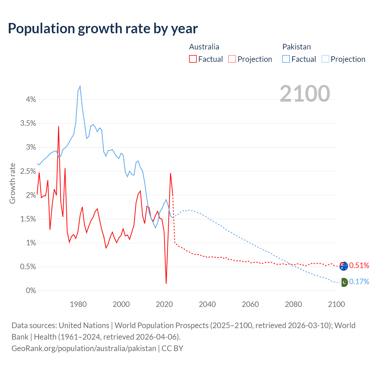 Data sources: World Bank | Health (1960–2024, retrieved 2026-04-06); United Nations | World Population Prospects (1960–2026, retrieved 2026-03-10); U.S. Census Bureau (1960–2025, retrieved 2026-02-08); Central Intelligence Agency (CIA) (2000–2019, retrieved 2026-02-20).