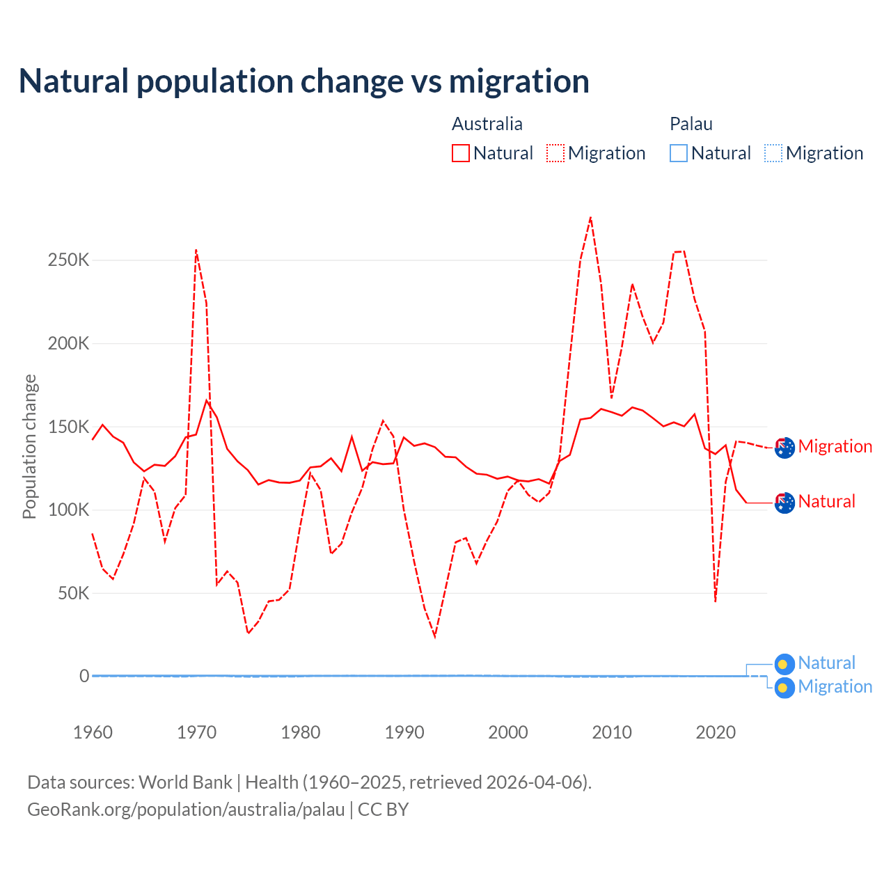 Over the last 10 years, 43.6% of the population change in Australia is from natural causes (a gain of 1,389,408 people) and 56.4% is from migration (a gain of 1,798,171 people). In Palau 53.8% is from natural causes (a gain of 264 people) and 46.2% is from migration (a loss of 227 people).