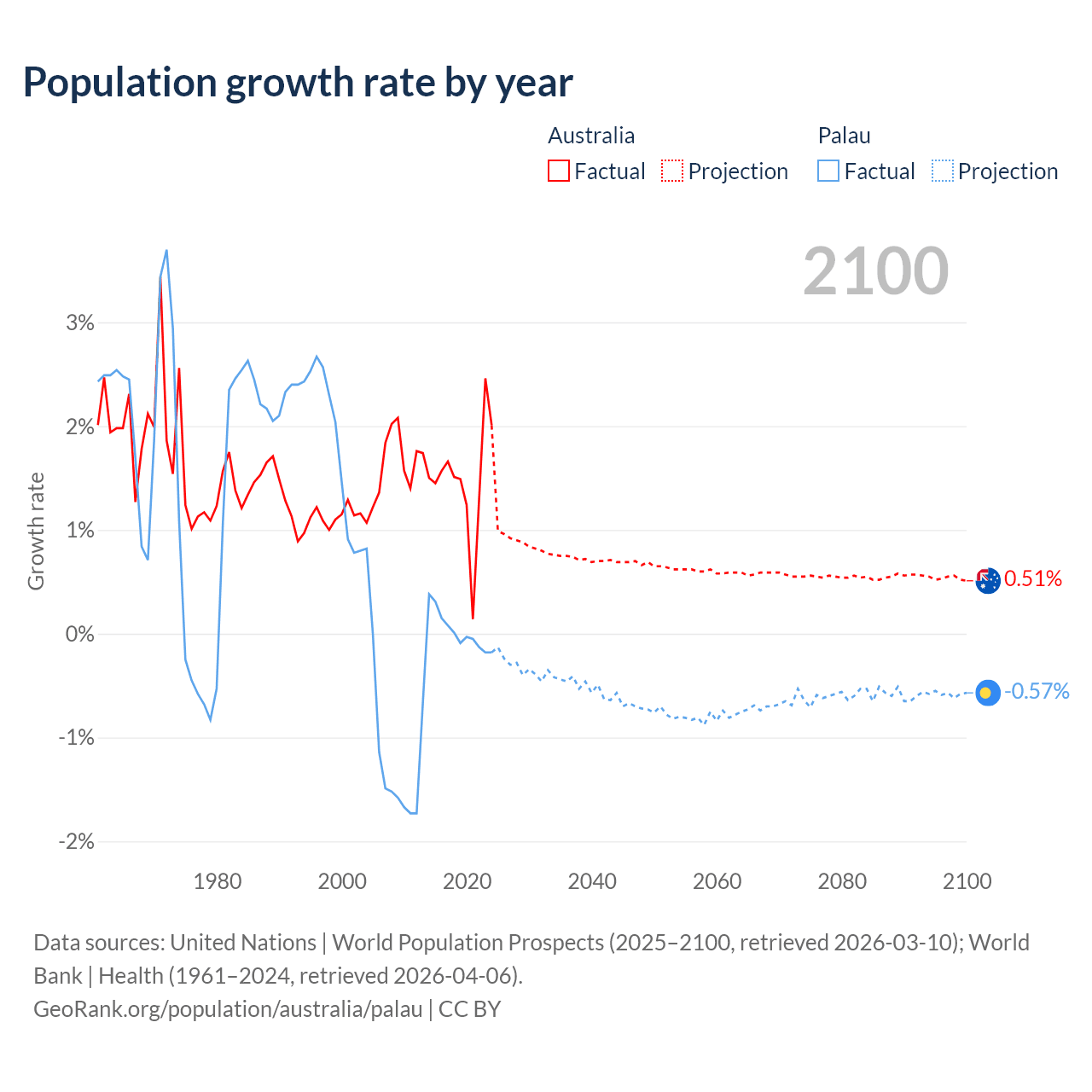 - For the last 10 years, Australia has had an average growth rate of +1.49% per year vs +0.02% in Palau.