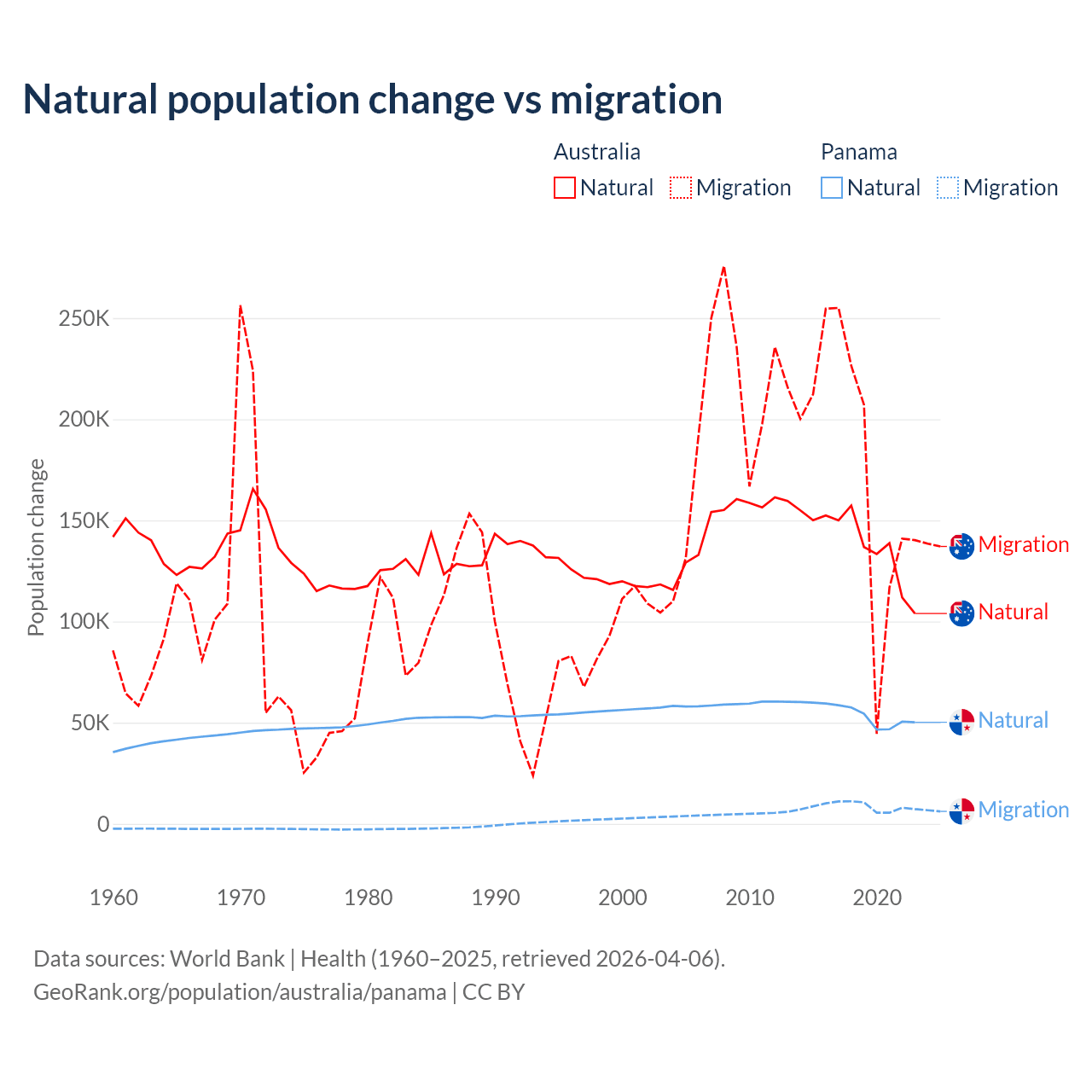 Over the last 10 years, 43.6% of the population change in Australia is from natural causes (a gain of 1,389,408 people) and 56.4% is from migration (a gain of 1,798,171 people). In Panama 86.5% is from natural causes (a gain of 544,211 people) and 13.5% is from migration (a gain of 84,849 people).