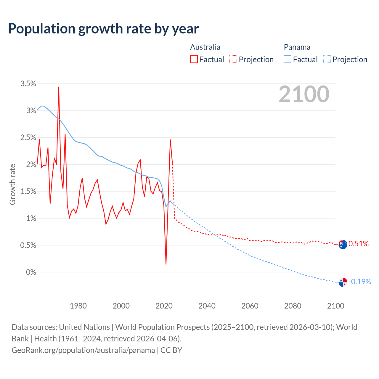- For the last 10 years, Australia has had an average growth rate of +1.49% per year vs +1.52% in Panama.