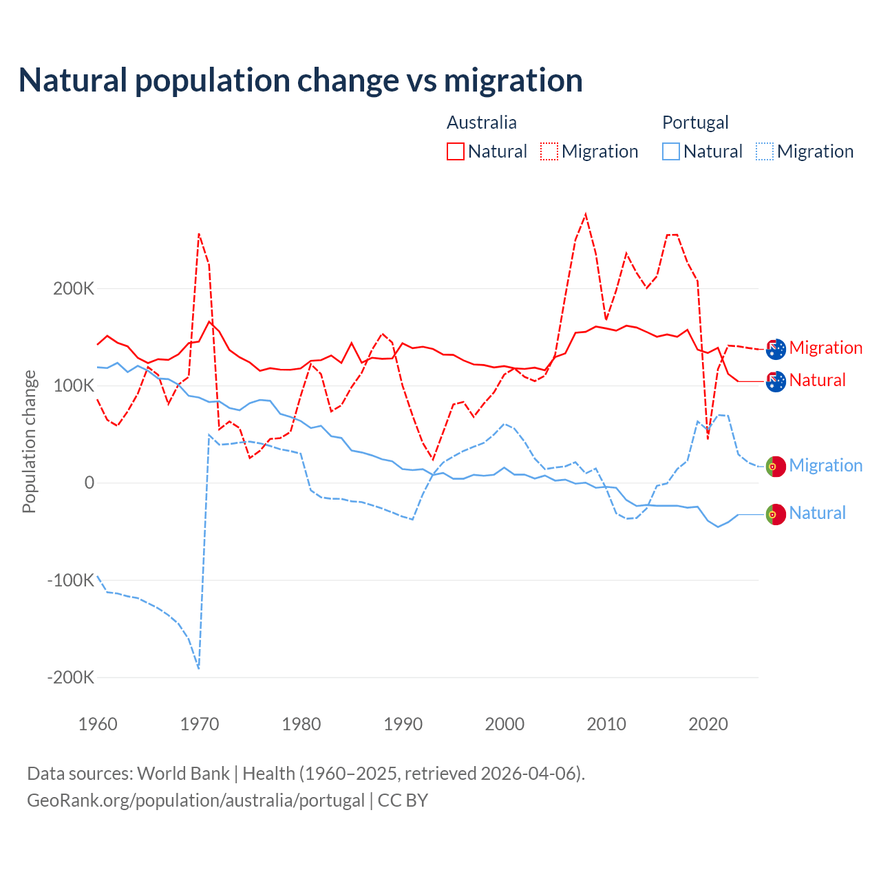 Over the last 10 years, 43.6% of the population change in Australia is from natural causes (a gain of 1,389,408 people) and 56.4% is from migration (a gain of 1,798,171 people). In Portugal 51% is from natural causes (a loss of 302,748 people) and 49% is from migration (a gain of 290,554 people).