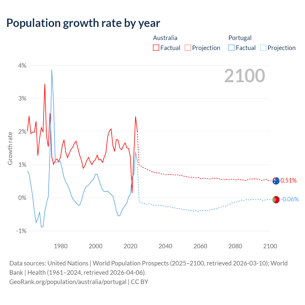 - For the last 10 years, Australia has had an average growth rate of +1.49% per year vs +0.21% in Portugal.