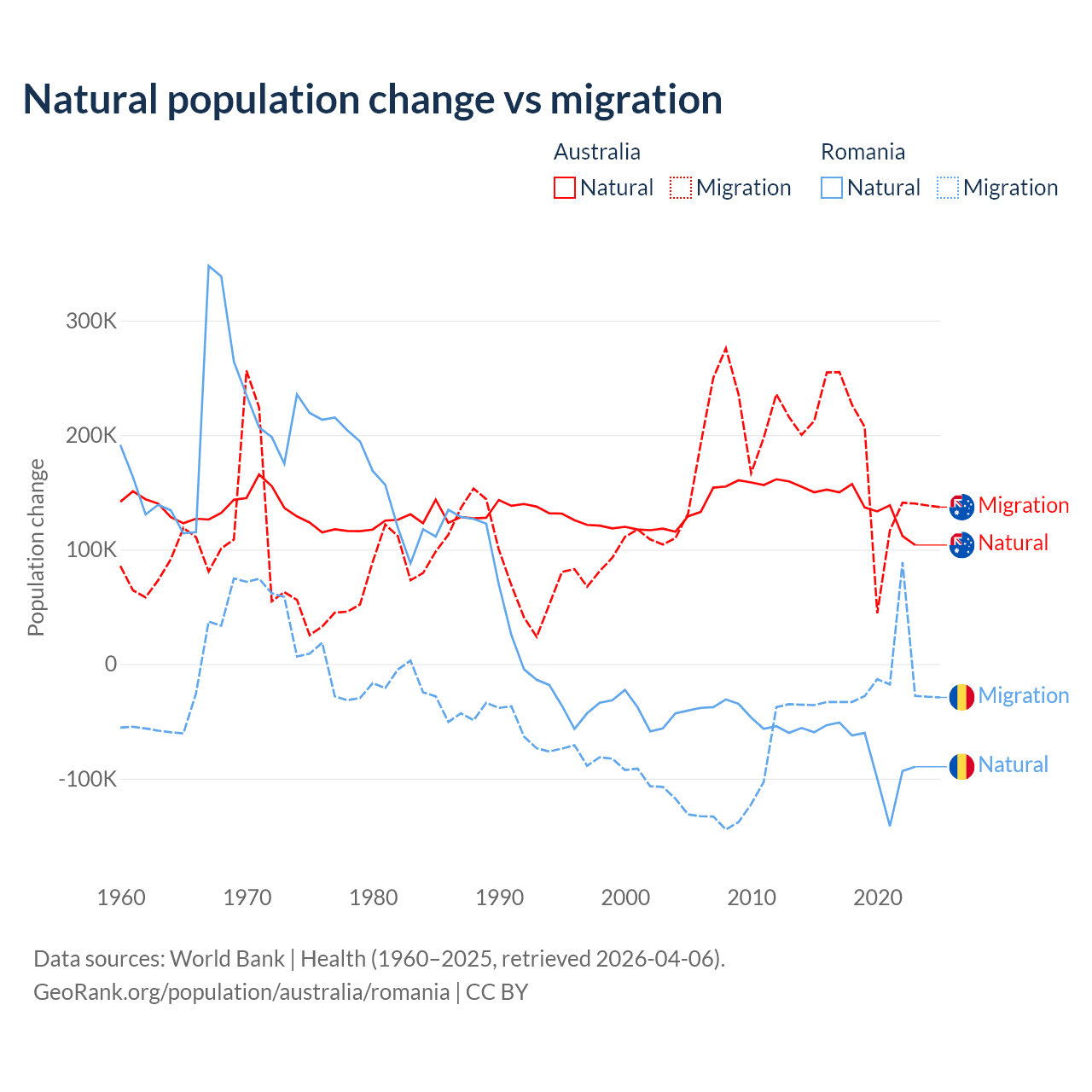 Over the last 10 years, 43.6% of the population change in Australia is from natural causes (a gain of 1,389,408 people) and 56.4% is from migration (a gain of 1,798,171 people). In Romania 82% is from natural causes (a loss of 766,295 people) and 18% is from migration (a loss of 167,917 people).