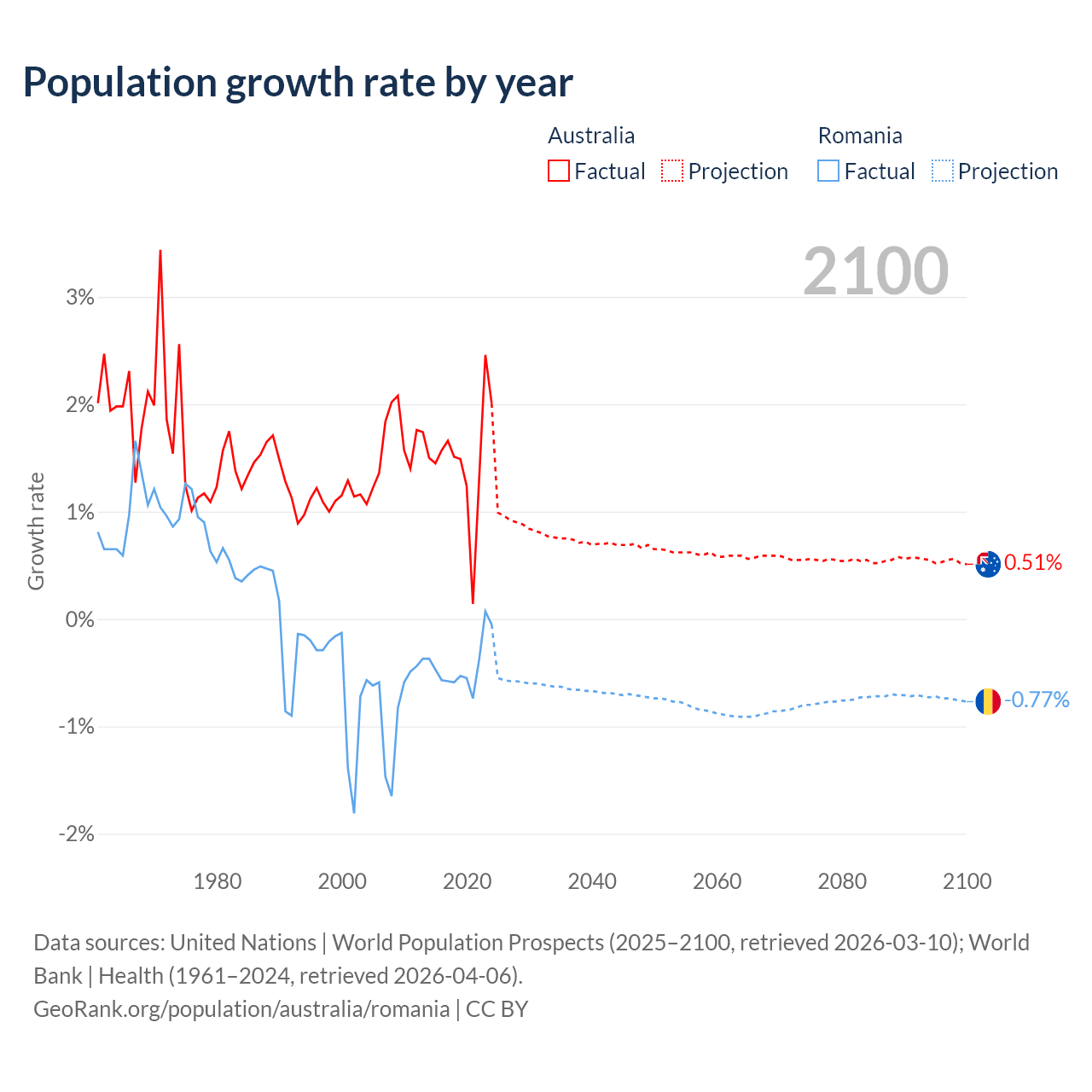 - For the last 10 years, Australia has had an average growth rate of +1.49% per year vs -0.43% in Romania.