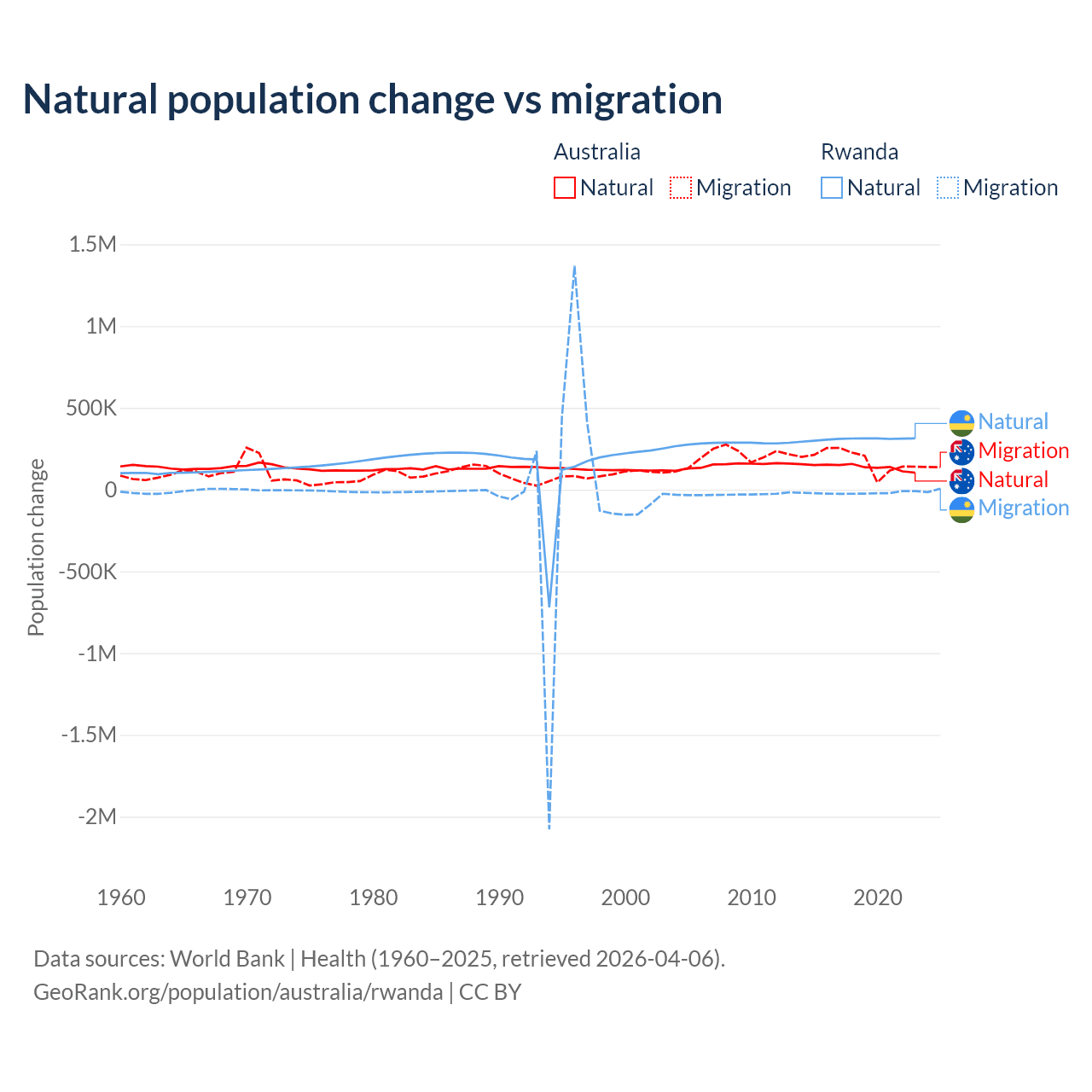 Over the last 10 years, 43.6% of the population change in Australia is from natural causes (a gain of 1,389,408 people) and 56.4% is from migration (a gain of 1,798,171 people). In Rwanda 93.8% is from natural causes (a gain of 3,081,296 people) and 6.18% is from migration (a loss of 203,035 people).