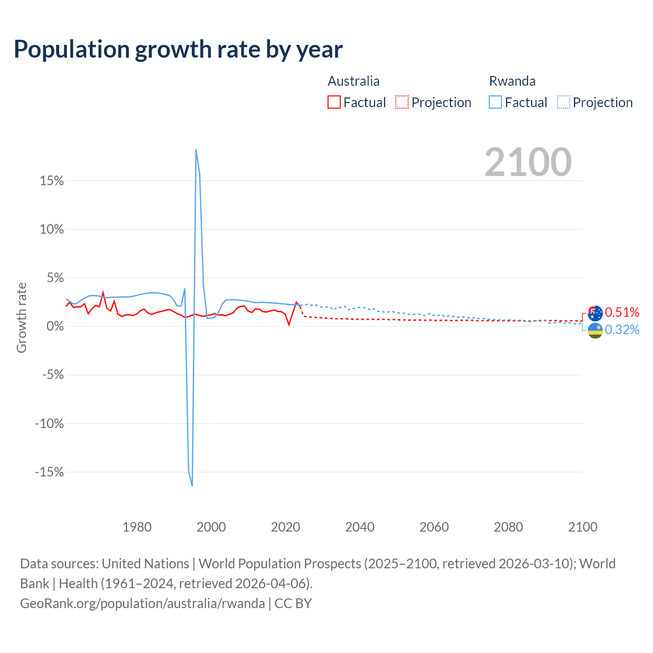 - For the last 10 years, Australia has had an average growth rate of +1.49% per year vs +2.31% in Rwanda.