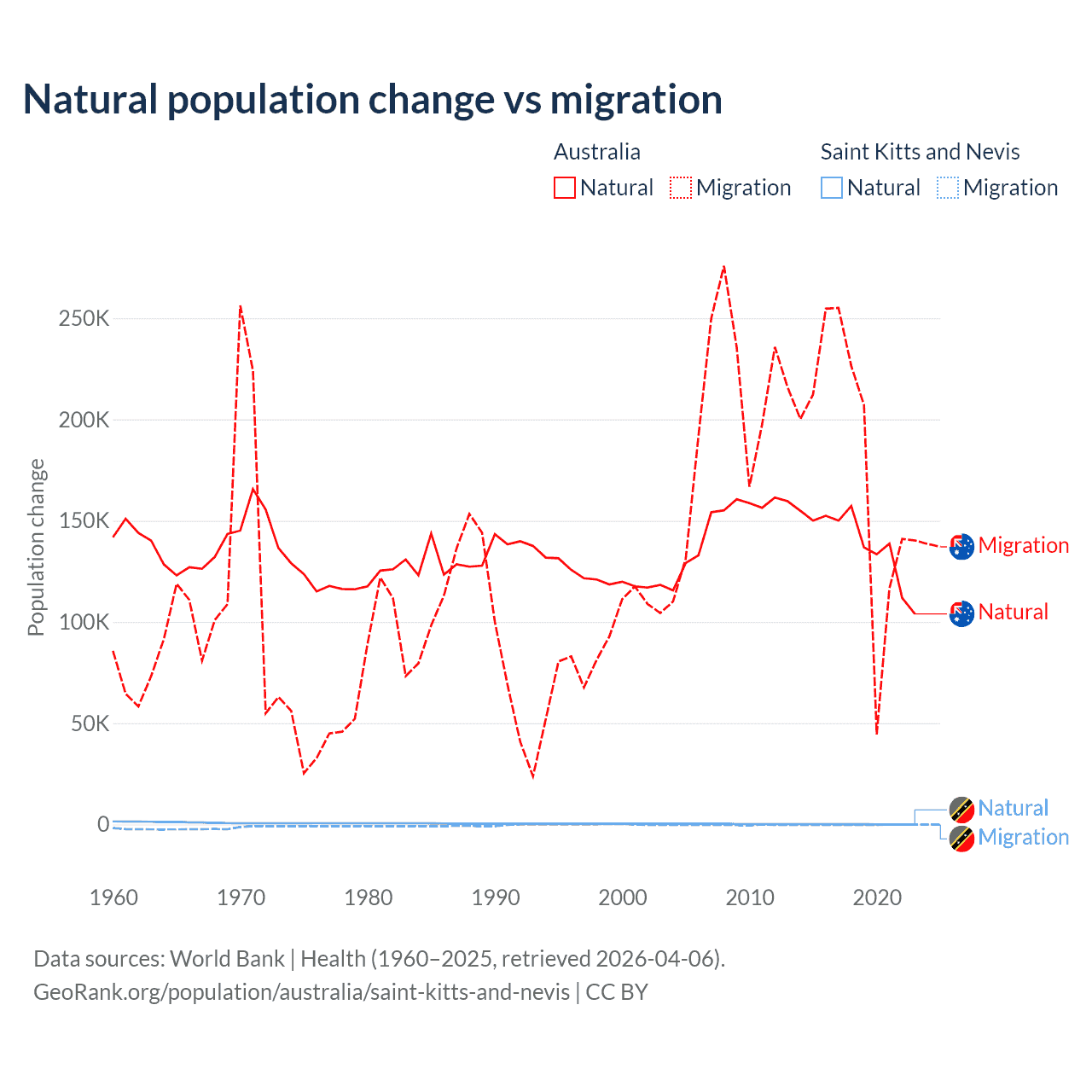 Over the last 10 years, 43.6% of the population change in Australia is from natural causes (a gain of 1,389,408 people) and 56.4% is from migration (a gain of 1,798,171 people). In Saint Kitts and Nevis 44.9% is from natural causes (a gain of 1,225 people) and 55.1% is from migration (a loss of 1,506 people).