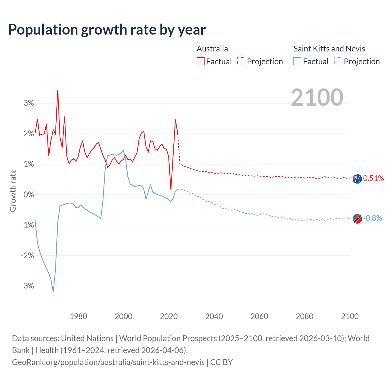 - For the last 10 years, Australia has had an average growth rate of +1.49% per year vs -0.04% in Saint Kitts and Nevis.