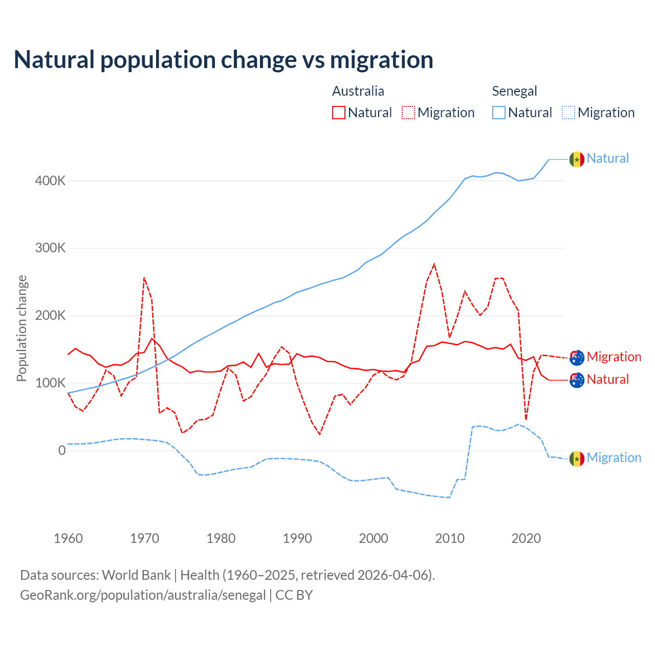 Over the last 10 years, 43.6% of the population change in Australia is from natural causes (a gain of 1,389,408 people) and 56.4% is from migration (a gain of 1,798,171 people). In Senegal 93.9% is from natural causes (a gain of 4,089,205 people) and 6.13% is from migration (a gain of 267,266 people).