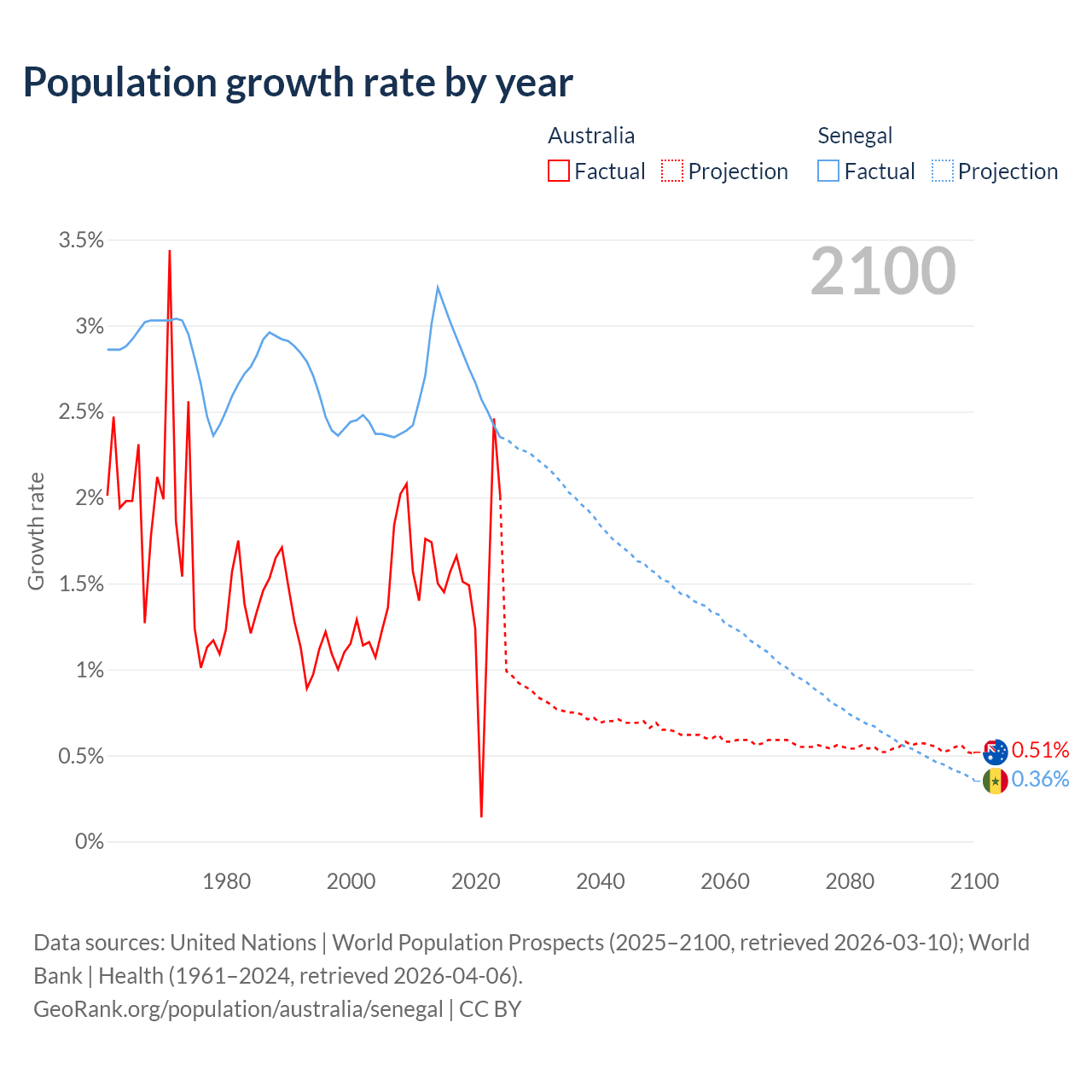 Australia vs Senegal: population by year and forecast