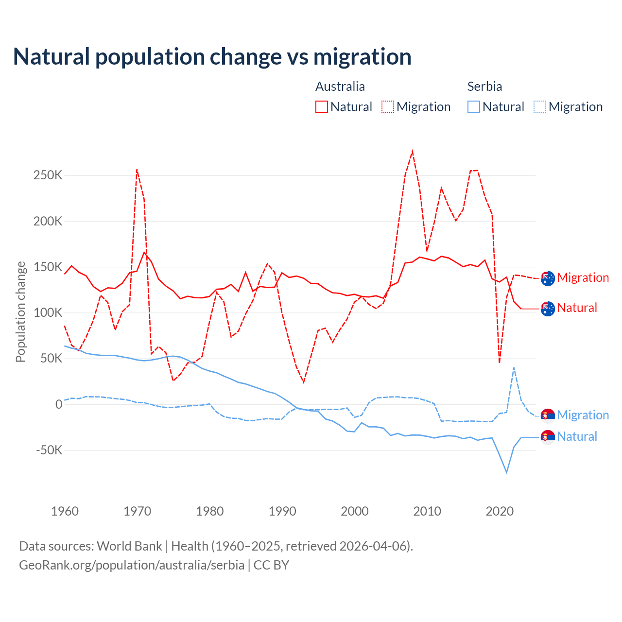 Over the last 10 years, 43.6% of the population change in Australia is from natural causes (a gain of 1,389,408 people) and 56.4% is from migration (a gain of 1,798,171 people). In Serbia 83.3% is from natural causes (a loss of 435,148 people) and 16.7% is from migration (a loss of 87,110 people).