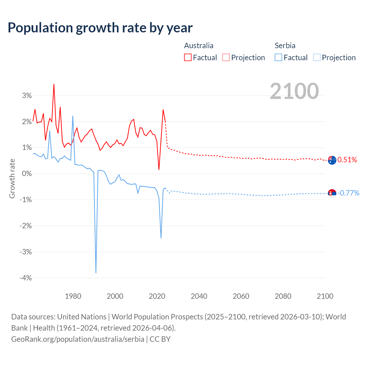- For the last 10 years, Australia has had an average growth rate of +1.49% per year vs -0.76% in Serbia.