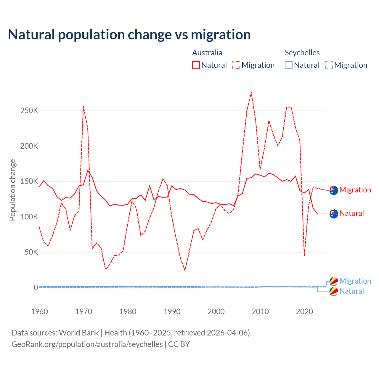 Over the last 10 years, 43.6% of the population change in Australia is from natural causes (a gain of 1,389,408 people) and 56.4% is from migration (a gain of 1,798,171 people). In the Seychelles 31.4% is from natural causes (a gain of 8,122 people) and 68.6% is from migration (a gain of 17,748 people).