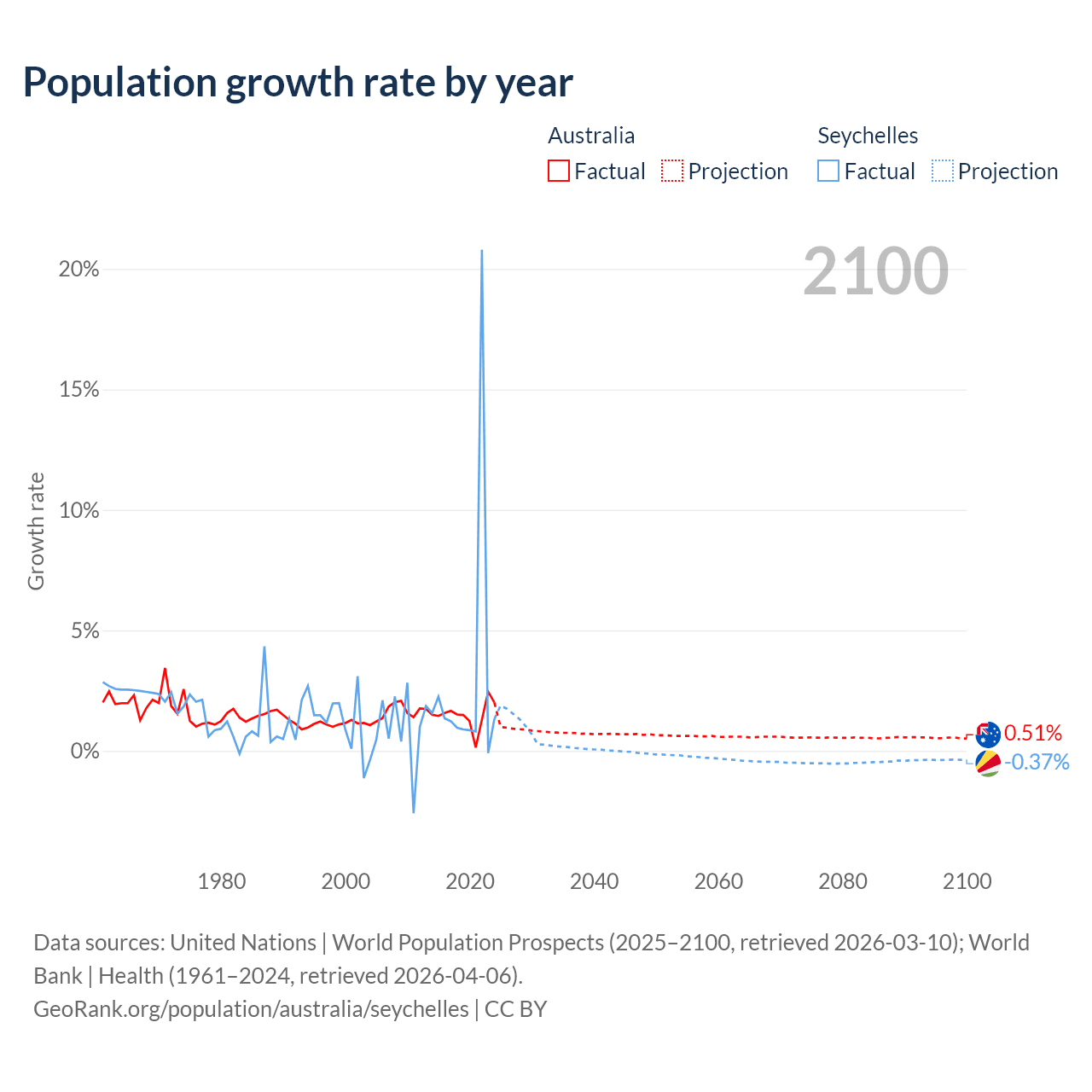 - For the last 10 years, Australia has had an average growth rate of +1.49% per year vs +2.9% in the Seychelles.